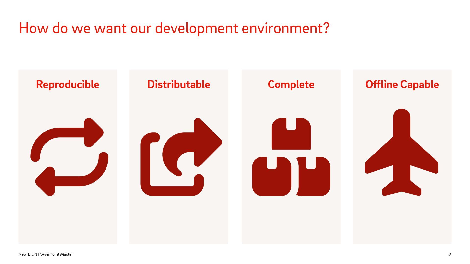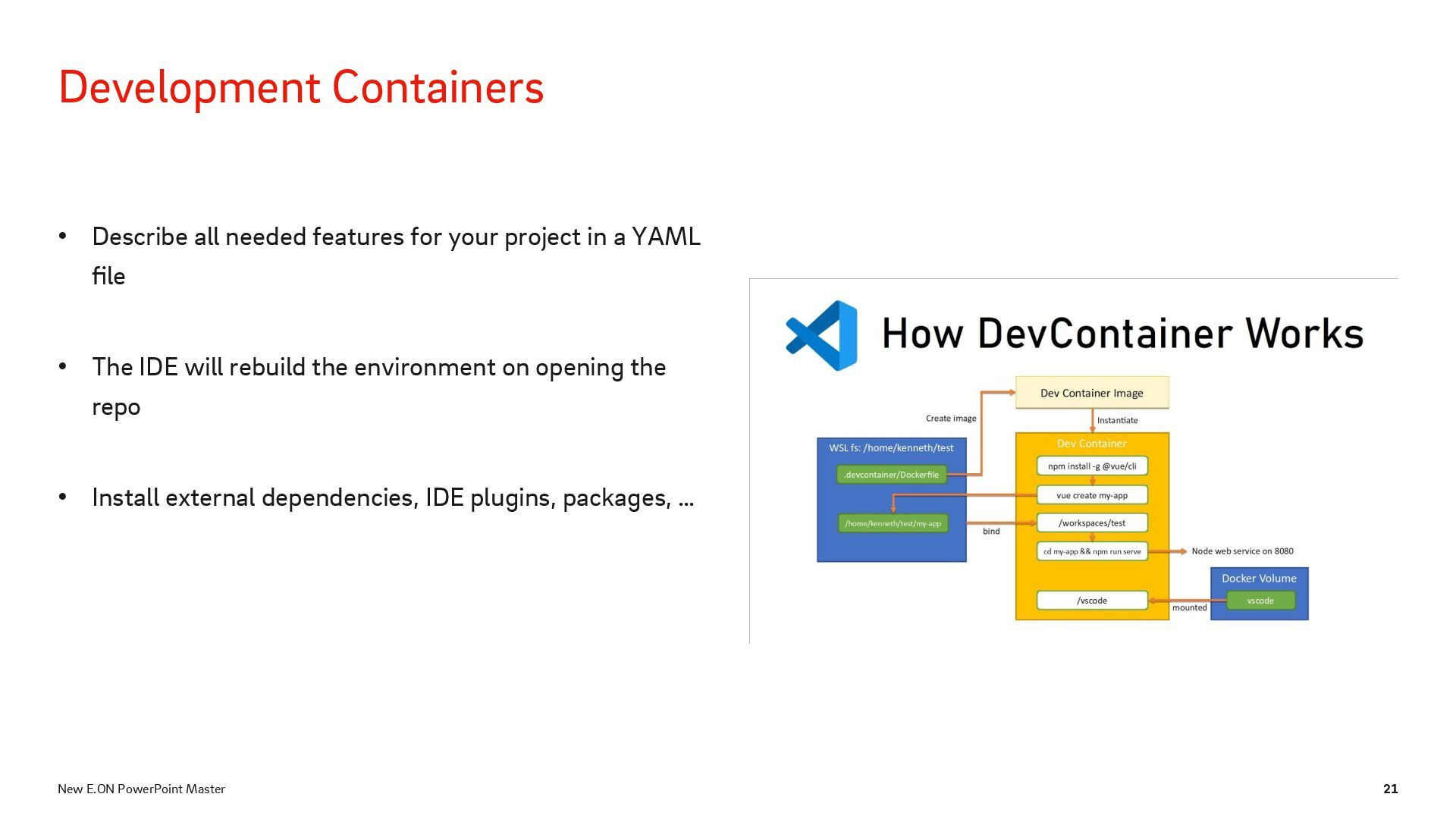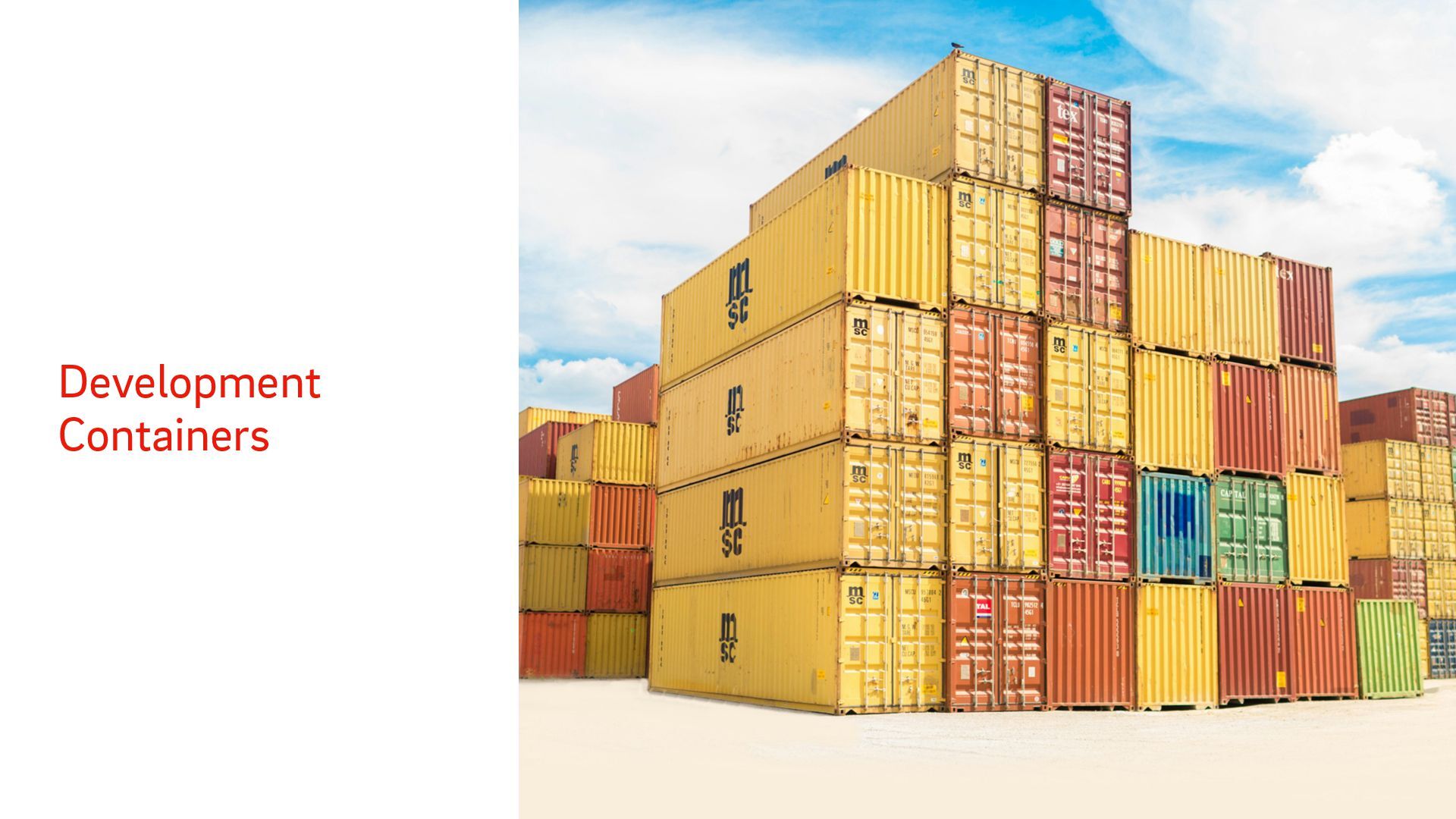 for your project in a YAML file • The IDE will rebuild the environment on opening the repo • Install external dependencies, IDE plugins, packages, … Development Containers