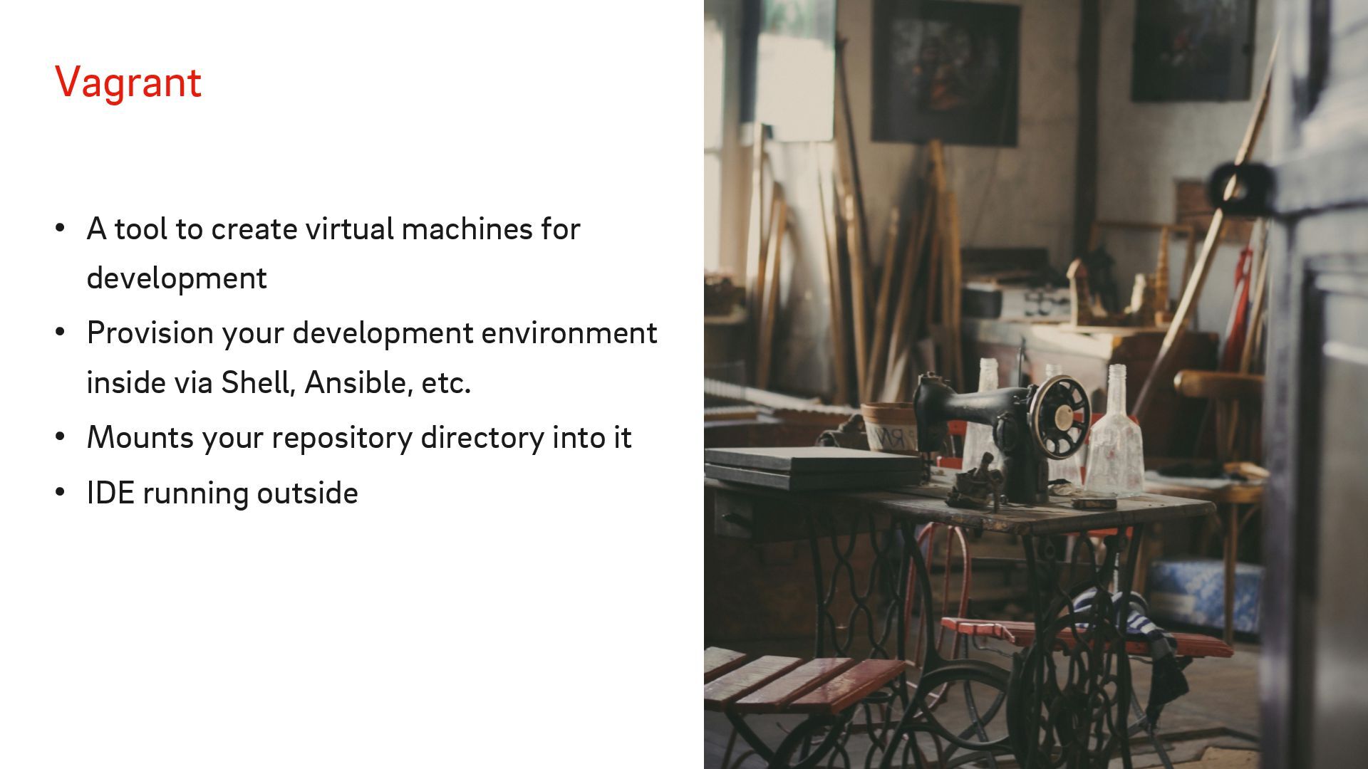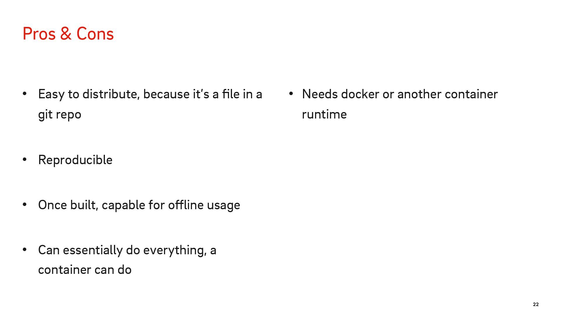 to distribute, because it’s a file in a git repo • Reproducible • Once built, capable for offline usage • Can essentially do everything, a container can do Pros & Cons