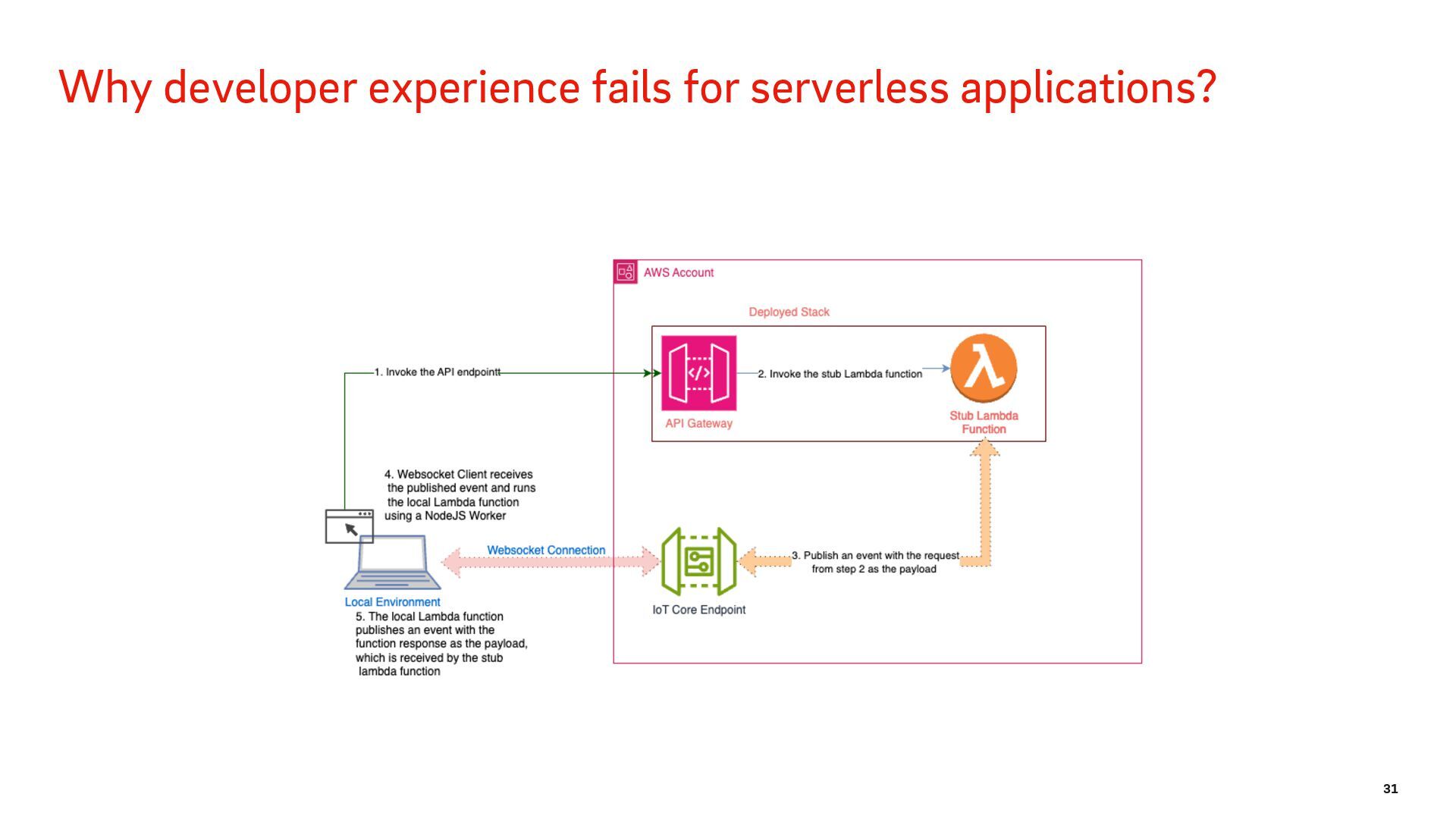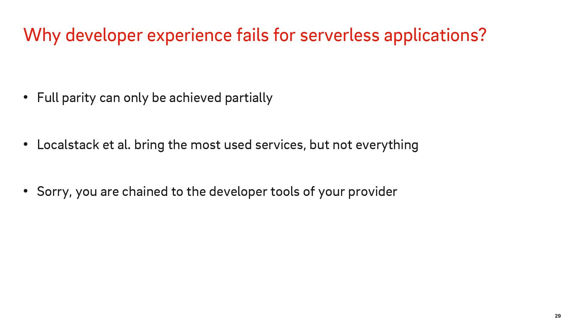 Localstack et al. bring the most used services, but not everything • Sorry, you are chained to the developer tools of your provider Why developer experience fails for serverless applications?