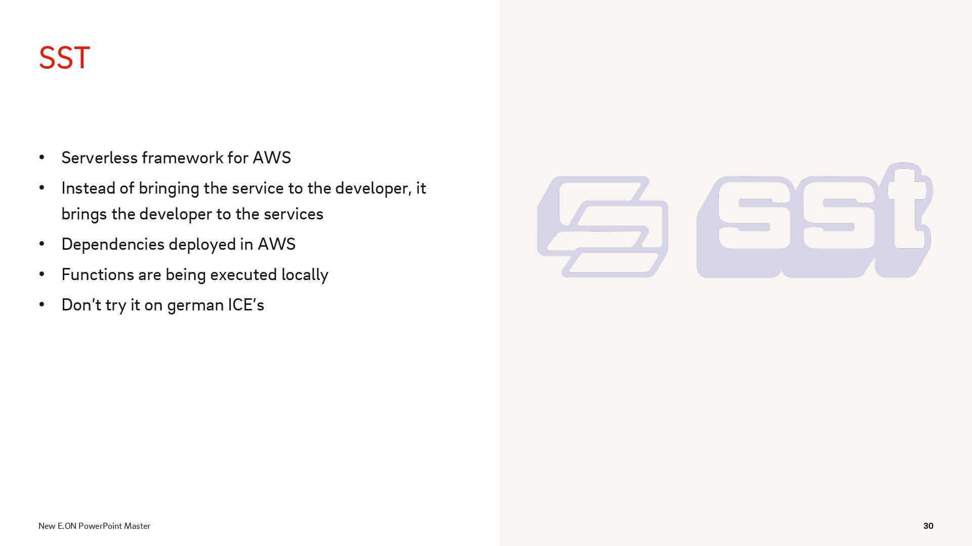 • Instead of bringing the service to the developer, it brings the developer to the services • Dependencies deployed in AWS • Functions are being executed locally • Don’t try it on german ICE’s SST