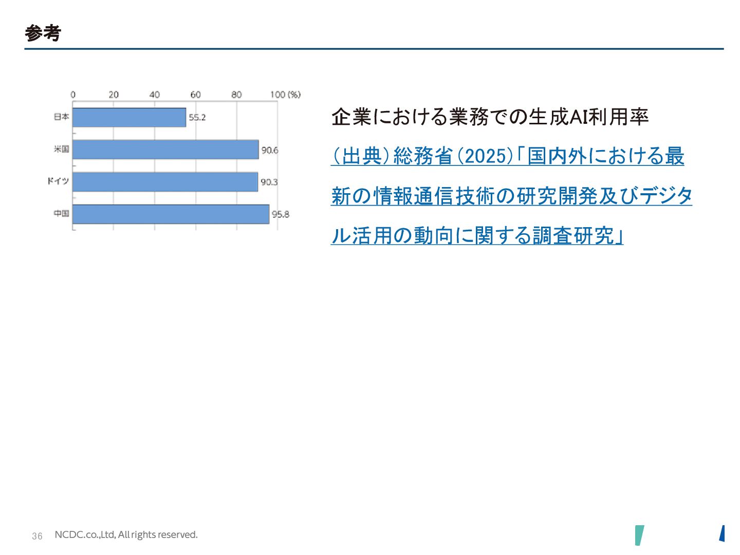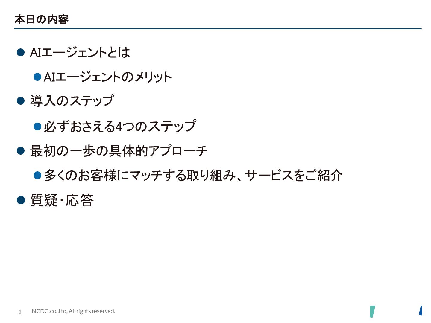 本格導入 AIエージェントを業務へ活用し、成果を追求す るフェーズ AIエージェント元年 「エージェント型AI」の活用が一気にトレンド これから目指すゴール 定型業務をAIに任せ、人間はクリエ イティブな仕事に集中する。 これは未来の話ではなく、今すぐ取り 組むべき現実的な選択肢です。