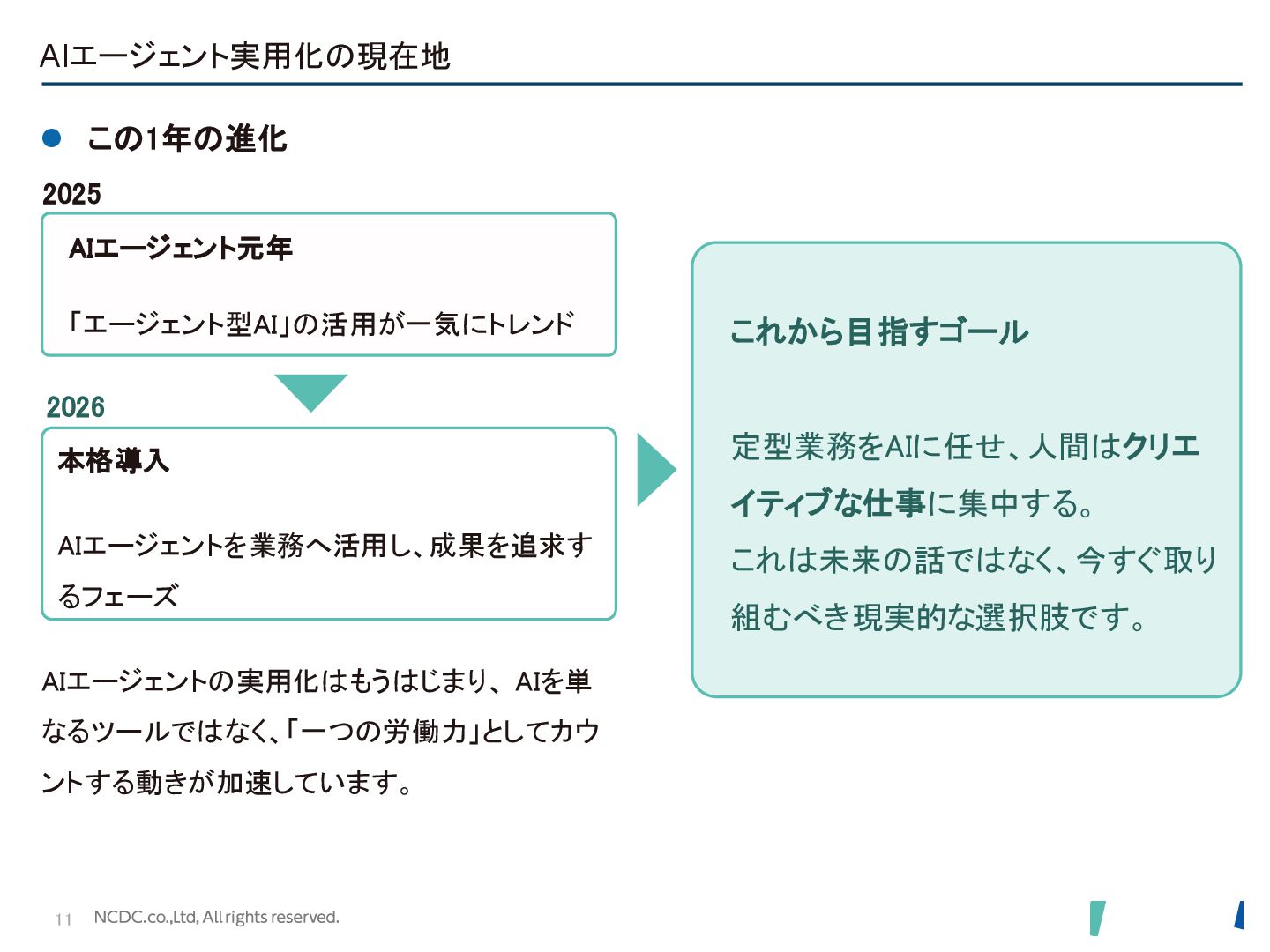 3. 2026 AIエージェント実用化の現在地 11 ⚫ この1年の進化 AIエージェントの実用化はもうはじまり、 AIを単 なるツールではなく、「一つの労働力」としてカウ ントする動きが加速しています。 2025