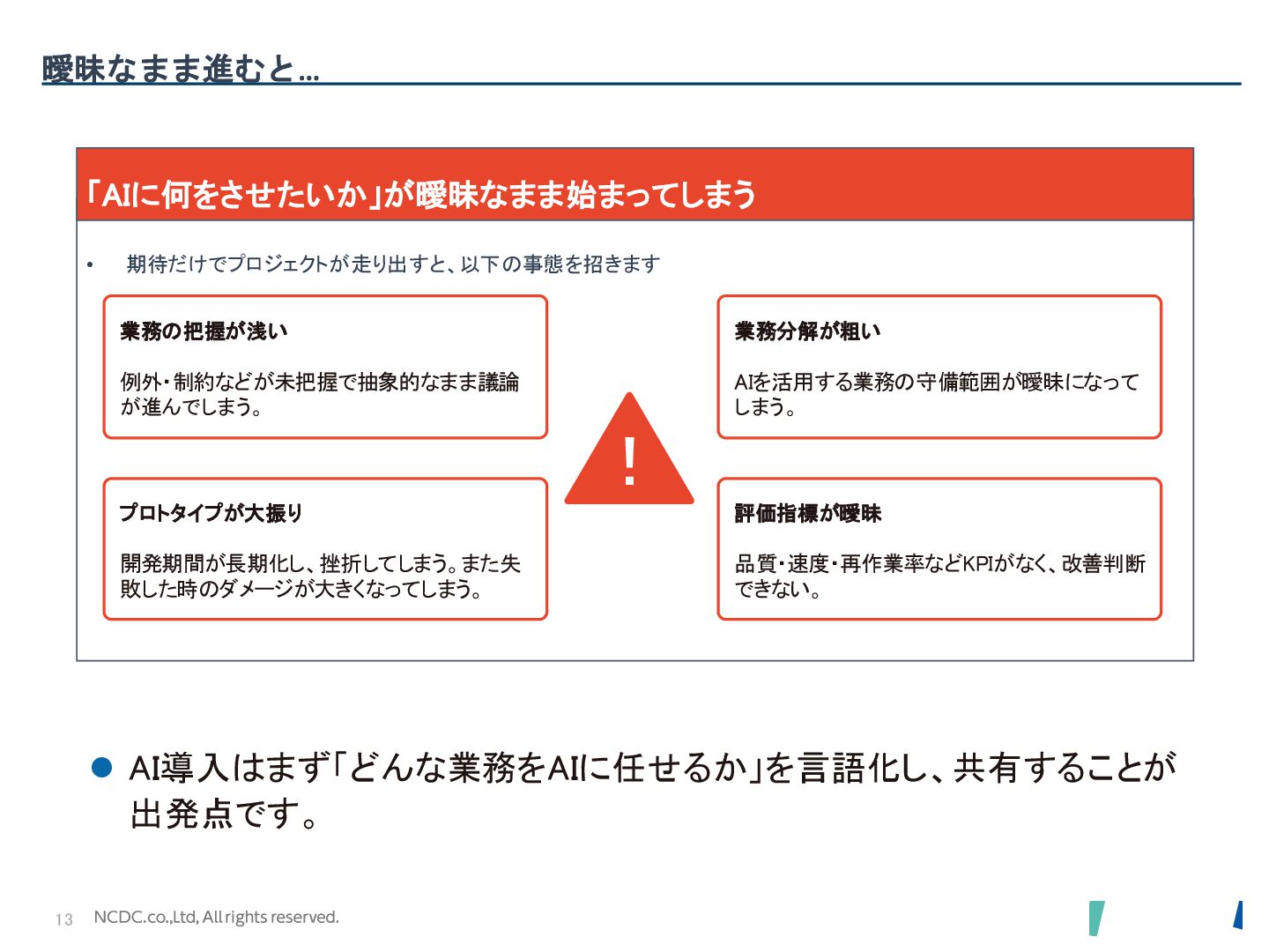 例外・制約などが未把握で抽象的なまま議論 が進んでしまう。 業務分解が粗い AIを活用する業務の守備範囲が曖昧になって しまう。 プロトタイプが大振り 開発期間が長期化し、挫折してしまう。また失 敗した時のダメージが大きくなってしまう。 評価指標が曖昧 品質・速度・再作業率などKPIがなく、改善判断 できない。