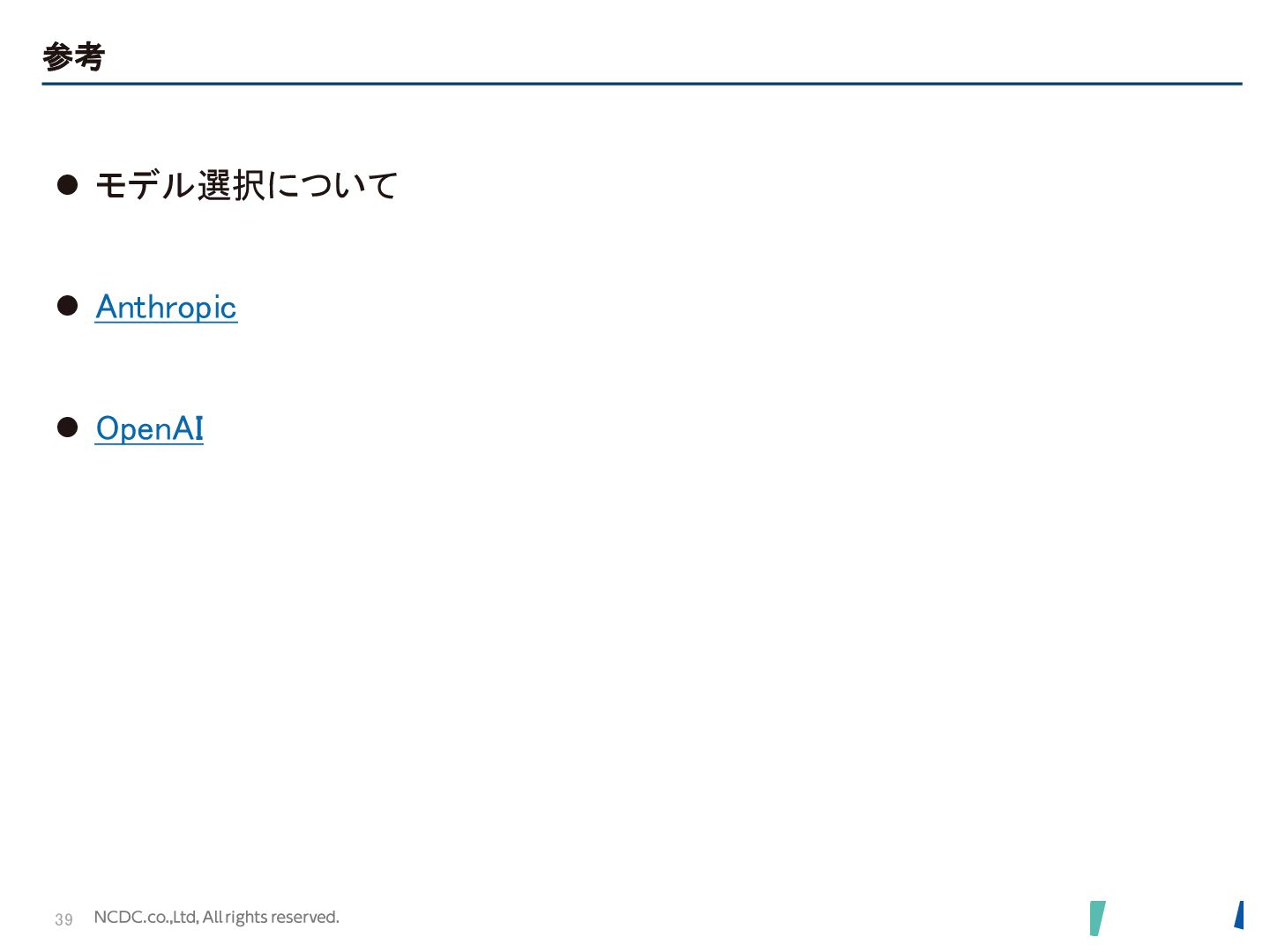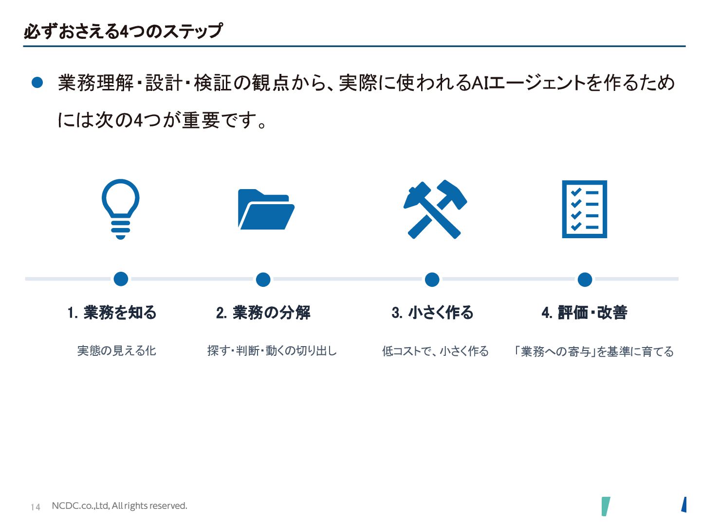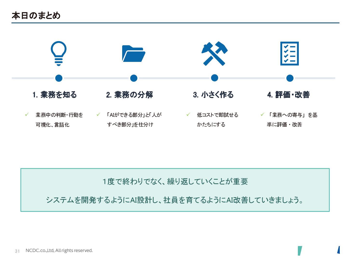 すべき部分」を仕分け ✓ 「業務への寄与」を基 準に評価・改善 1度で終わりでなく、繰り返していくことが重要 システムを開発するようにAI設計し、社員を育てるようにAI改善していきましょう。 1. 業務を知る 2. 業務の分解 3. 小さく作る 4. 評価・改善