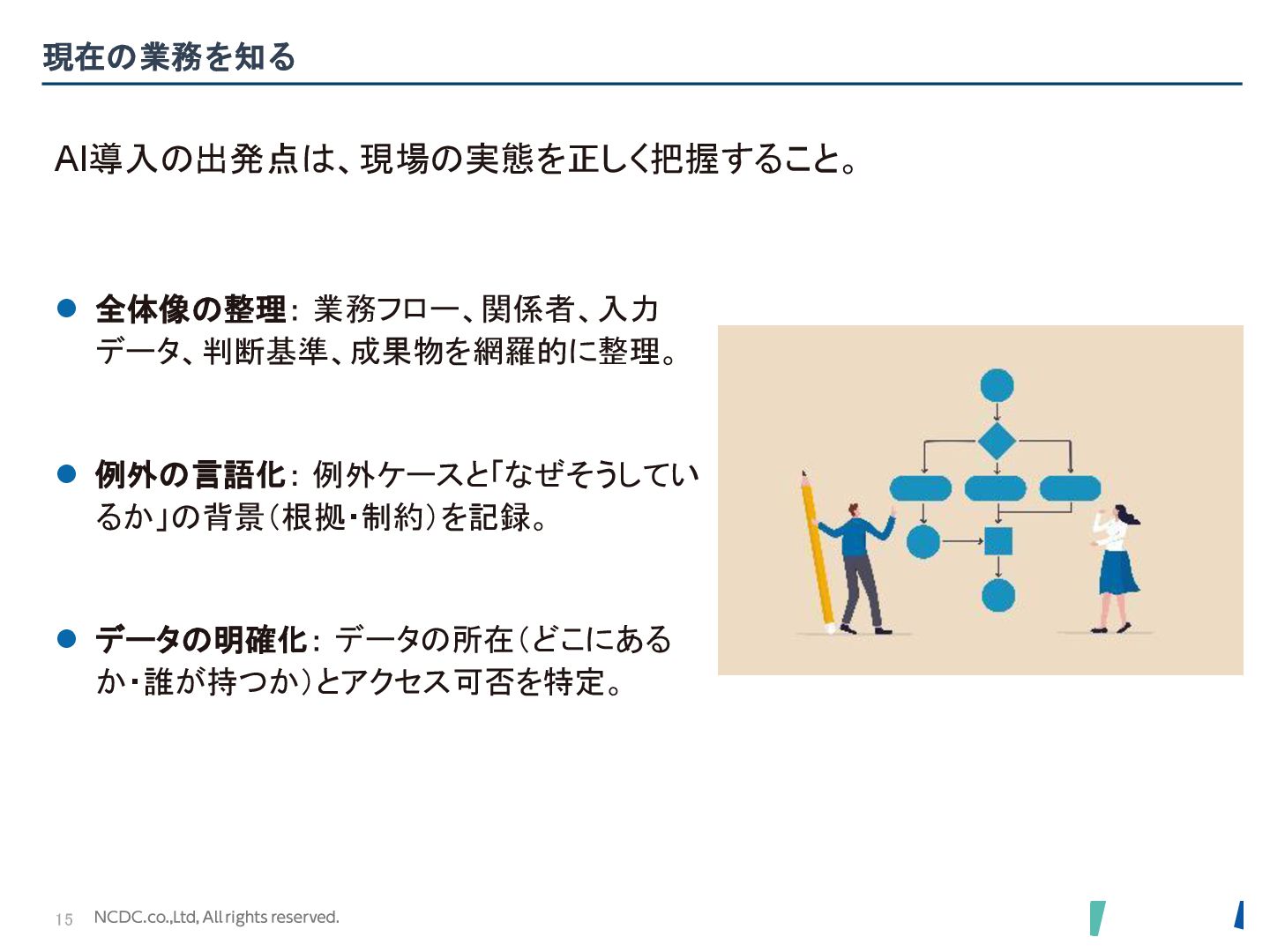 ⚫ データの明確化: データの所在(どこにある か・誰が持つか)とアクセス可否を特定。 AI導入の出発点は、現場の実態を正しく把握すること。