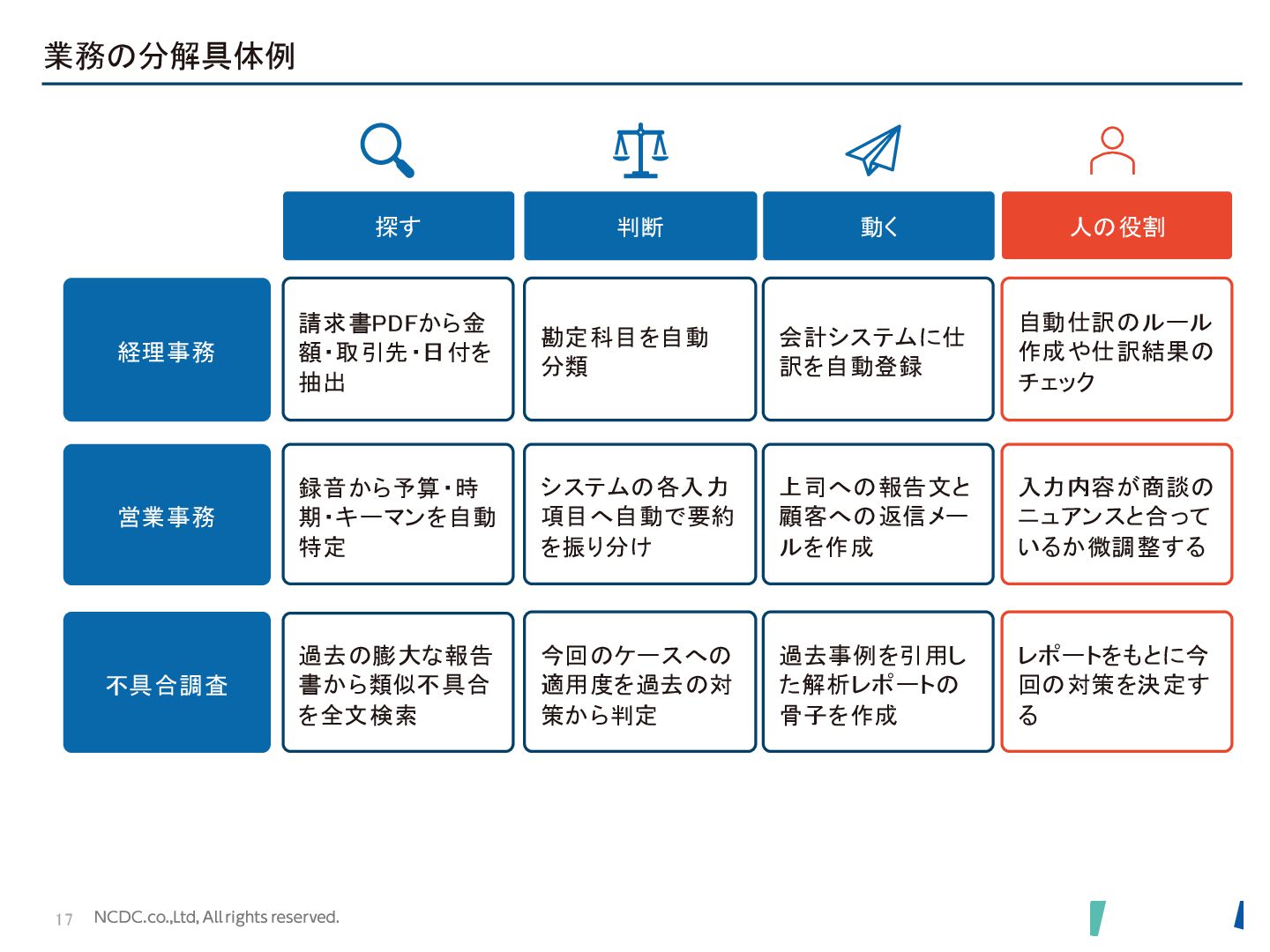 書から類似不具合 を全文検索 動く 判断 探す 勘定科目を自動 分類 システムの各入力 項目へ自動で要約 を振り分け 今回のケースへの 適用度を過去の対 策から判定 会計システムに仕 訳を自動登録 上司への報告文と 顧客への返信メー ルを作成 過去事例を引用し た解析レポートの 骨子を作成 自動仕訳のルール 作成や仕訳結果の チェック 経理事務 営業事務 不具合調査 入力内容が商談の ニュアンスと合って いるか微調整する レポートをもとに今 回の対策を決定す る
