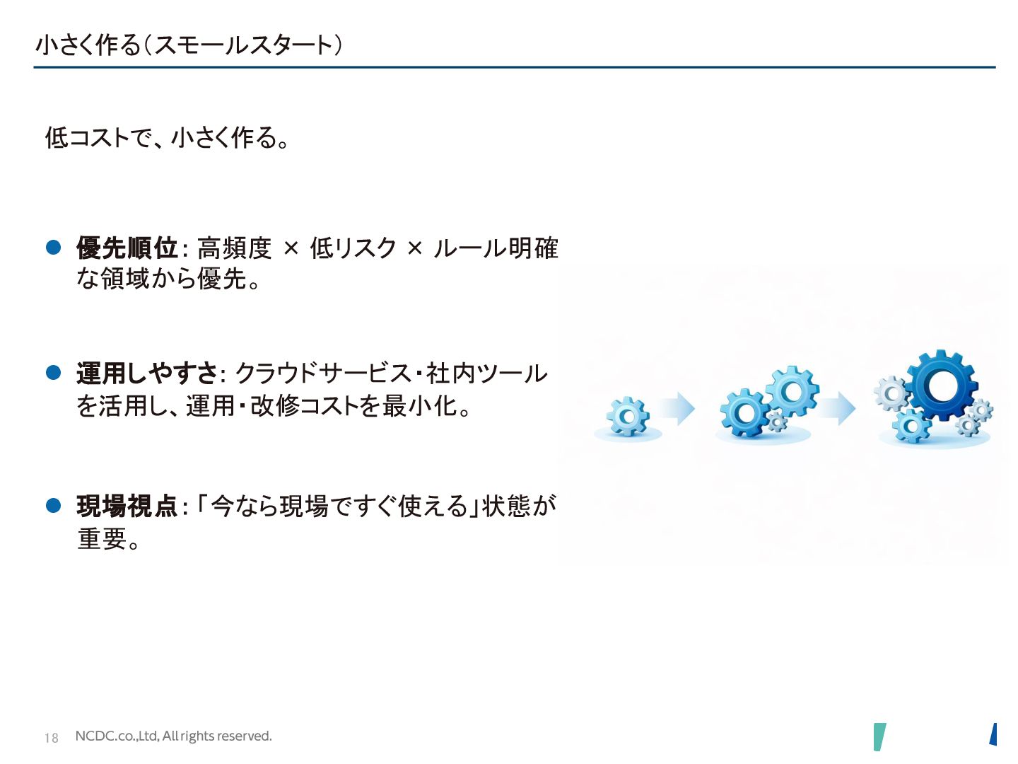 8. 小さく作る(スモールスタート) 18 ⚫ 優先順位: 高頻度 × 低リスク × ルール明確 な領域から優先。