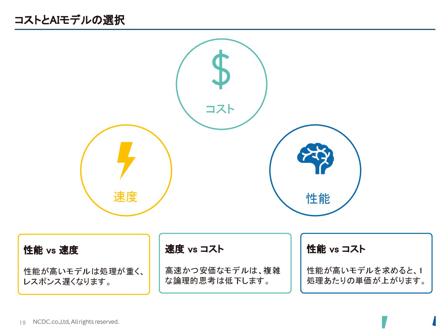 処理あたりの単価が上がります。 性能 vs 速度 性能が高いモデルは処理が重く、 レスポンス遅くなります。 速度 vs コスト 高速かつ安価なモデルは、複雑 な論理的思考は低下します。