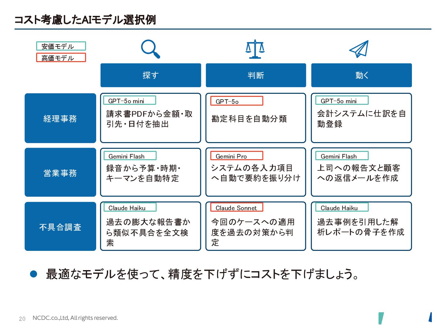 索 動く 判断 探す 勘定科目を自動分類 システムの各入力項目 へ自動で要約を振り分け 今回のケースへの適用 度を過去の対策から判 定 会計システムに仕訳を自 動登録 上司への報告文と顧客 への返信メールを作成 過去事例を引用した解 析レポートの骨子を作成 経理事務 営業事務 不具合調査 高価モデル Claude Sonnet GPT-5o Gemini Pro Claude Haiku GPT-5o mini GPT-5o mini Claude Haiku Gemini Flash Gemini Flash 安価モデル