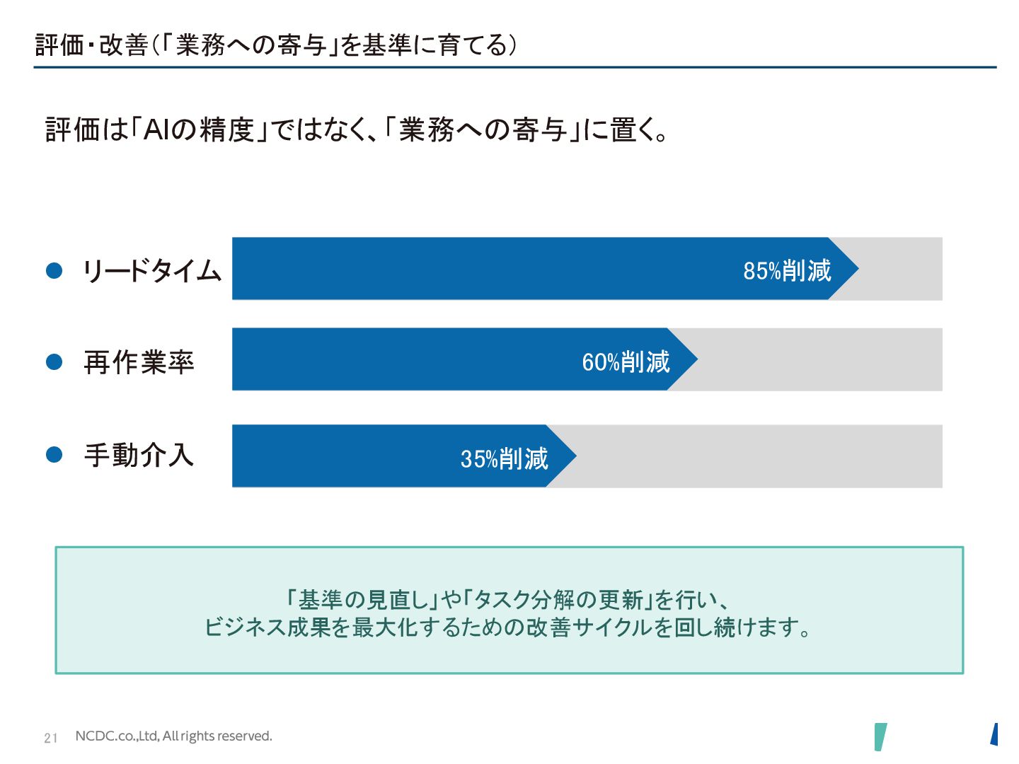 手動介入 評価は「AIの精度」ではなく、「業務への寄与」に置く。 「基準の見直し」や「タスク分解の更新」を行い、 ビジネス成果を最大化するための改善サイクルを回し続けます。