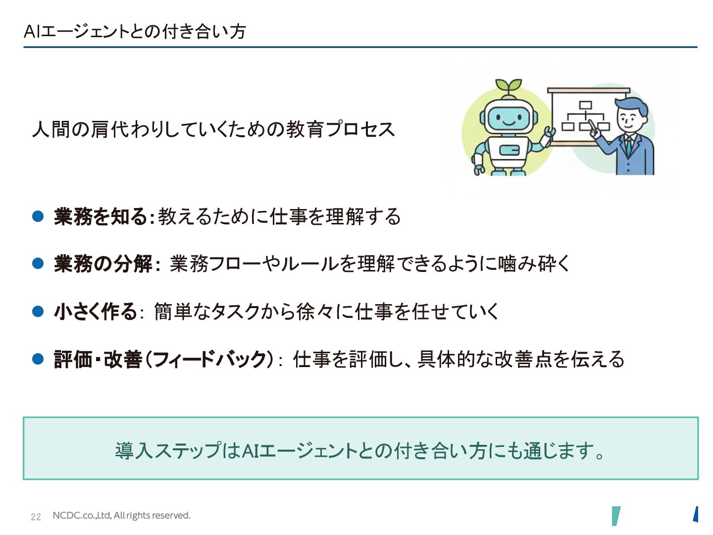 ⚫ 評価・改善(フィードバック): 仕事を評価し、具体的な改善点を伝える 導入ステップはAIエージェントとの付き合い方にも通じます。 人間の肩代わりしていくための教育プロセス