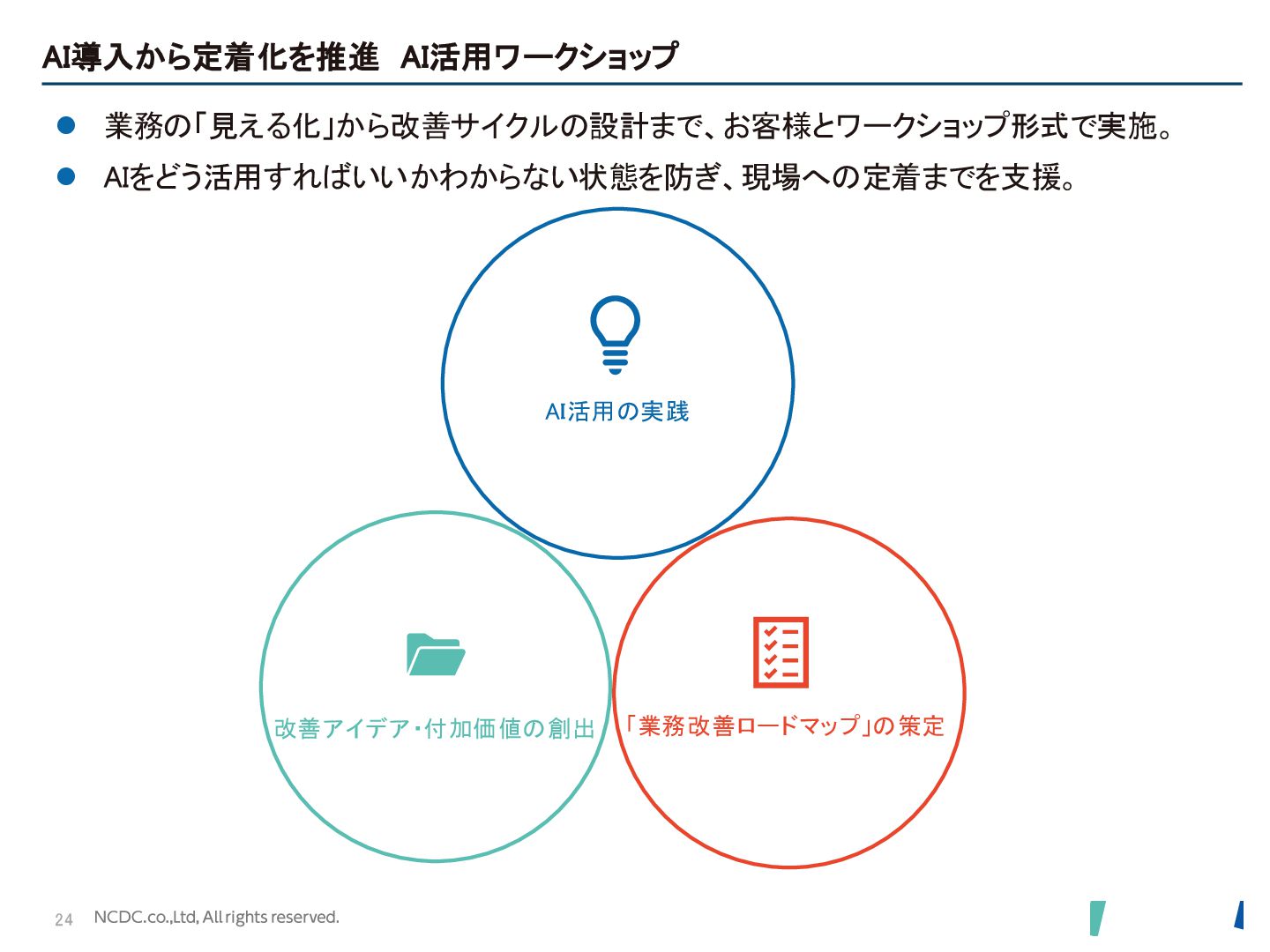 者の負荷が高止まり。対応品質が担 当者ごとにばらつき、業務効率の改 善が急務となっている。 組織課題 新しいツールやデジタル施策に苦手 意識を持つ社員が多く、業務プロセ スの刷新が進まない。 属人化 「問い合わせ内容をどう判断して誰に 相談するか」という判断基準が明文 化されておらず、特定メンバーの経 験に依存している。 改善アイデア・付加価値の創出 問い合わせ対応プロセスを可視化し、 AIが支援できるポイントと、人が価値 を発揮するポイントを再定義。 「業務改善ロードマップ」の策定 導入 → 運用 → 改善のロードマップ を作成。現場が主体的に改善を続け られる仕組みを整備。 ワークショップを通じて「組織全体の積極的な姿勢の醸成」を実現します。 課 題 ワ ー ク シ ョ ッ プ の 成 果 ゴ ー ル 「問い合わせ内容をどう判断して誰にエスカレーションするか」という判断基準が明文化されておらず、特定メンバーの経験に依存している。