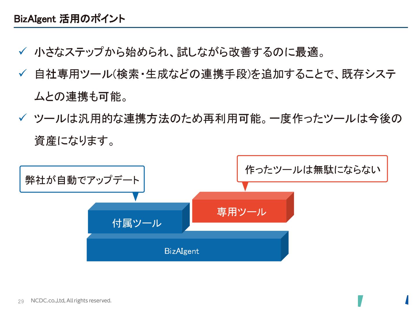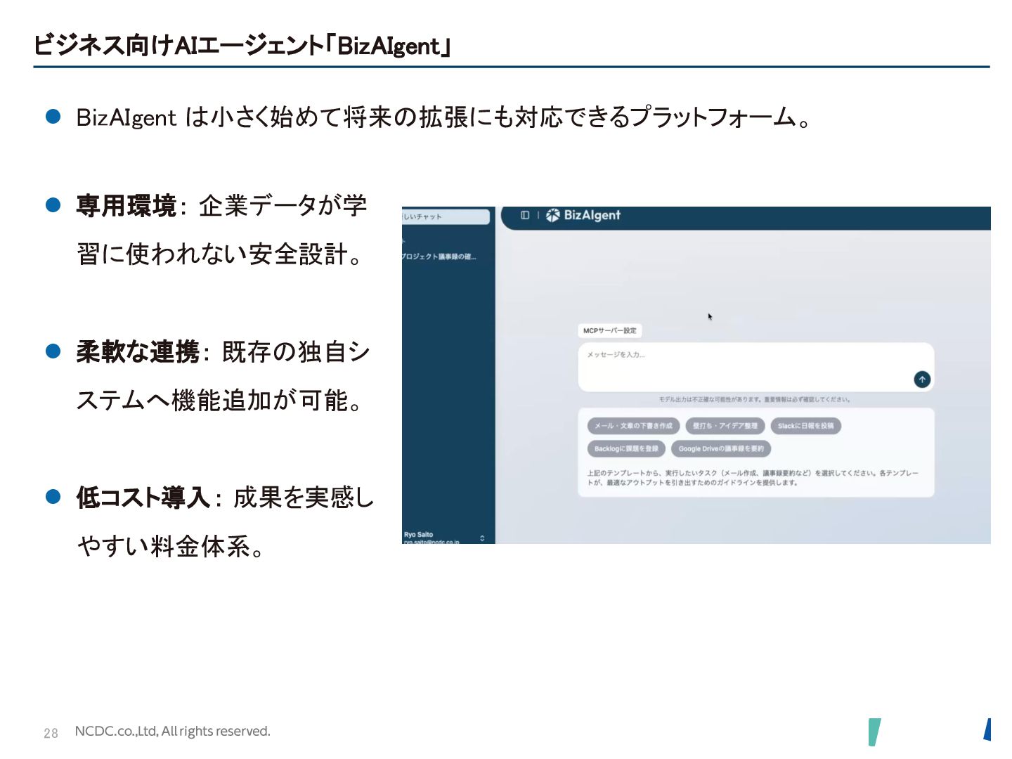 16. ビジネス向けAIエージェント「BizAIgent」 28 ⚫ 専用環境: 企業データが学 習に使われない安全設計。 ⚫ 柔軟な連携: 既存の独自シ ステムへ機能追加が可能。