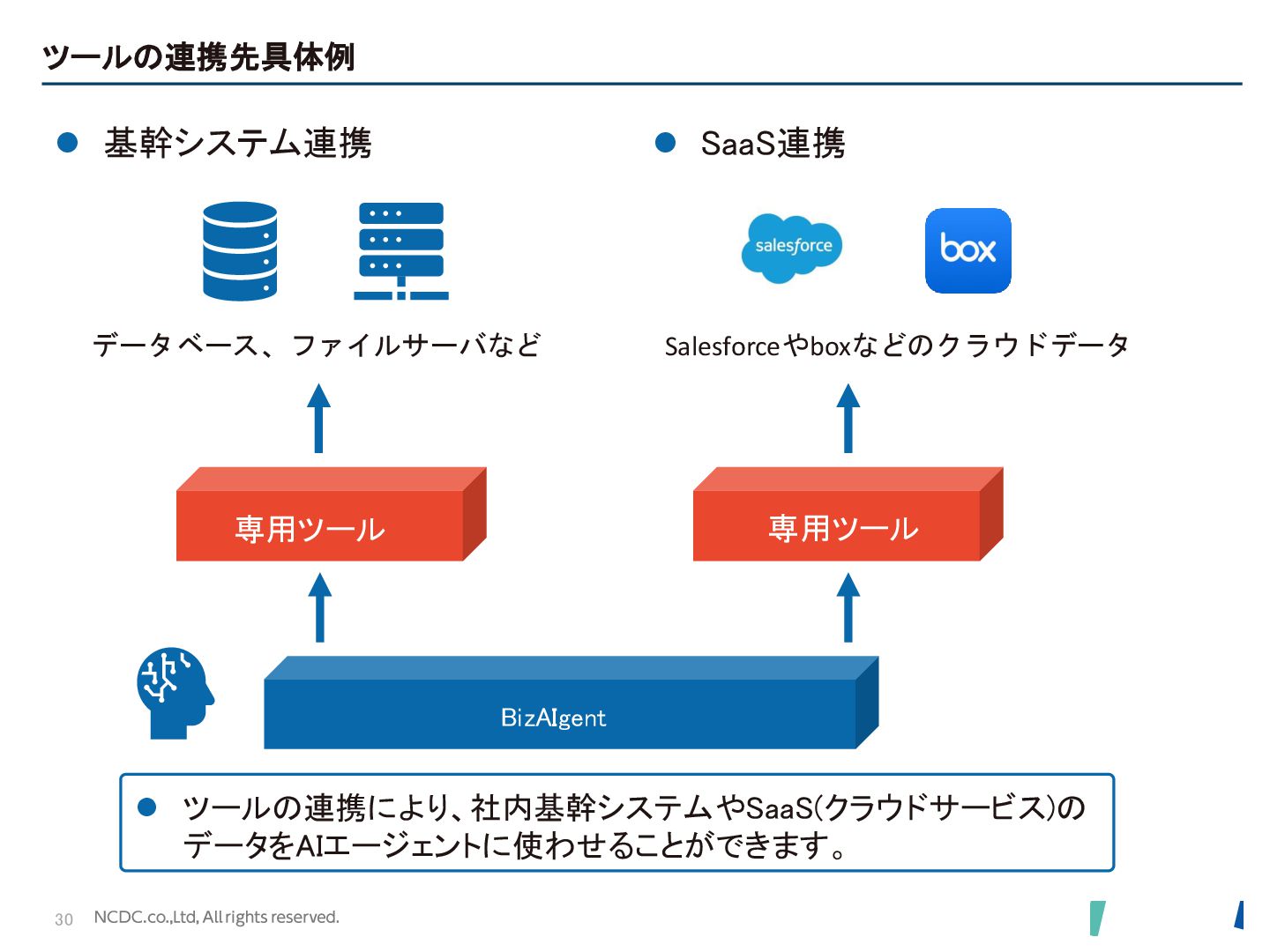 データベース、ファイルサーバなど Salesforceやboxなどのクラウドデータ ⚫ ツールの連携により、社内基幹システムやSaaS(クラウドサービス)の データをAIエージェントに使わせることができます。