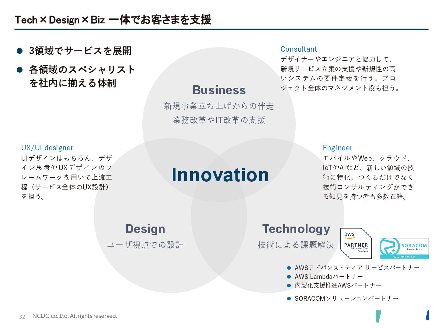新規サービス立案の支援や新規性の高 いシステムの要件定義を行う。プロ ジェクト全体のマネジメント役も担う。 UX/UI designer UIデザインはもちろん、デザ イン思考やUXデザインのフ レームワークを用いて上流工 程(サービス全体のUX設計) を担う。 Engineer モバイルやWeb、クラウド、 IoTやAIなど、新しい領域の技 術に特化。つくるだけでなく 技術コンサルティングができ る知見を持つ者も多数在籍。 Tech×Design×Biz 一体でお客さまを支援 ⚫ 3領域でサービスを展開 ⚫ 各領域のスペシャリスト を社内に揃える体制 32 ⚫ AWSアドバンストティア サービスパートナー ⚫ AWS Lambdaパートナー ⚫ 内製化支援推進AWSパートナー ⚫ SORACOMソリューションパートナー