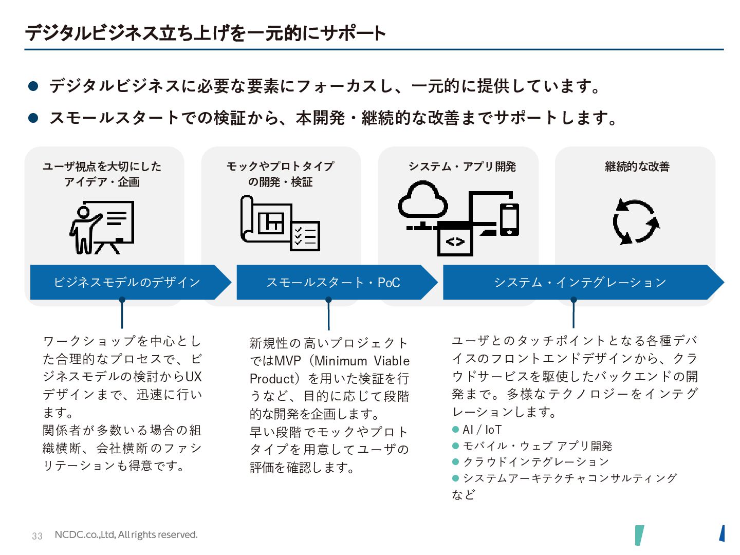 20. デジタルビジネス立ち上げを一元的にサポート ⚫ デジタルビジネスに必要な要素にフォーカスし、一元的に提供しています。 ⚫ スモールスタートでの検証から、本開発・継続的な改善までサポートします。 33 ワークショップを中心とし た合理的なプロセスで、ビ ジネスモデルの検討からUX デザインまで、迅速に行い
