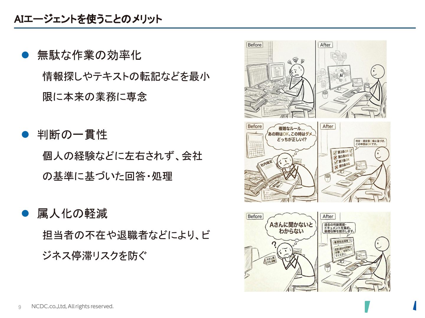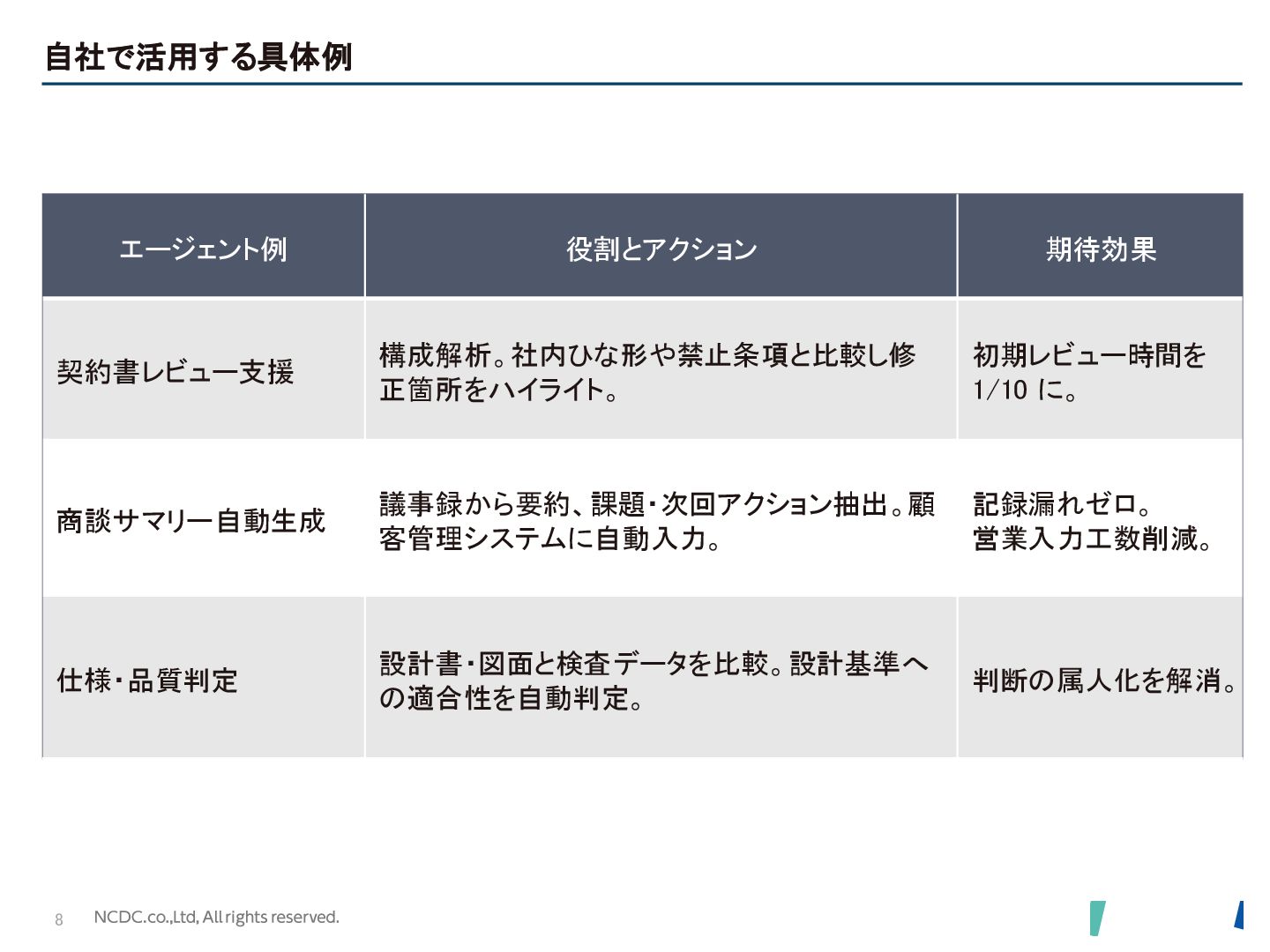 2. 自社で活用する具体例 8 エージェント例 役割とアクション 期待効果 契約書レビュー支援 構成解析。社内ひな形や禁止条項と比較し修 正箇所をハイライト。 初期レビュー時間を 1/10