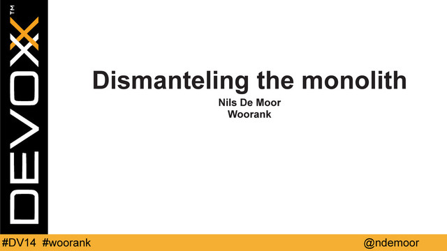 Going from an MVP to a product used daily by many customers doesn't happen overnight. Neither does its infrastructure. WooRank was built as a single application on just one database, where new features were stacking up... until it became a monolith that was barely scalable. Over the years the monolith has been deconstructed into little micro-services owning their own database of choice, and talking together to offer a smooth user experience. This enables the company to form small product teams that are responsible for building, deploying and maintaining their own services independently and allows people to move from team to team in a flexible way. This talk will cover the hurdles Woorank had to overcome, will share the hard lessons learned, and peek into what's to come in the near future.