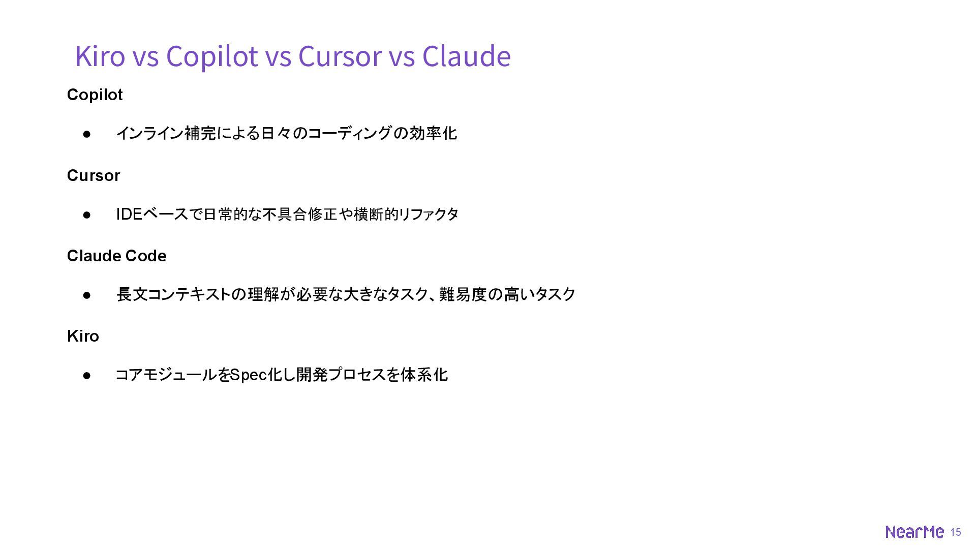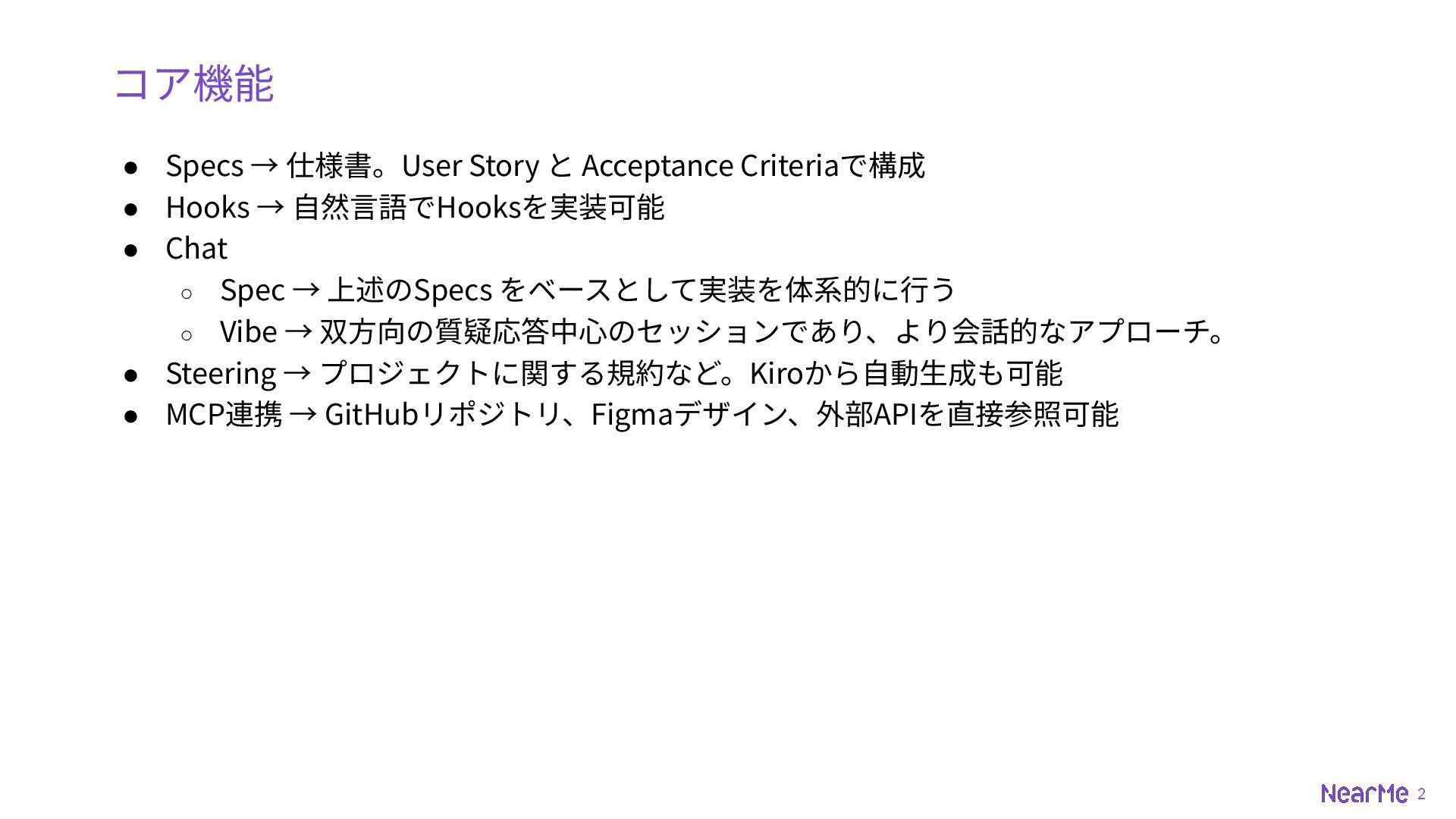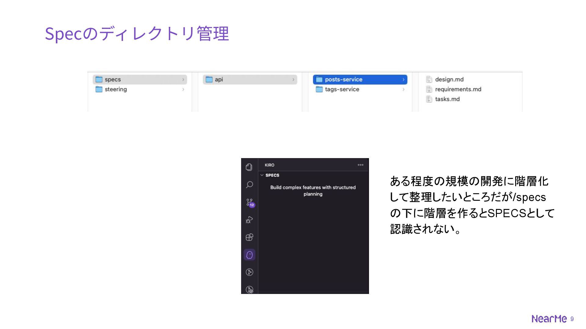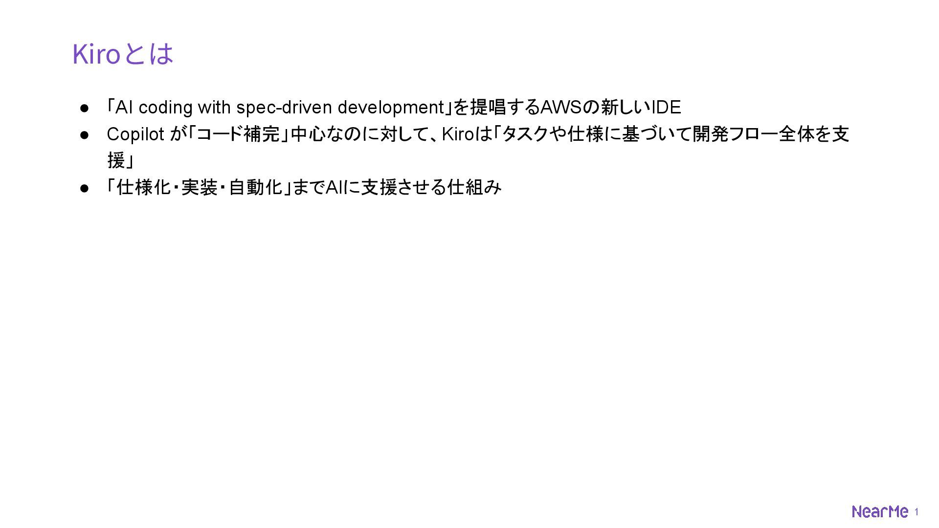 AWSが提唱する新しいIDE「Kiro」を実際に触ってみたハンズオン資料です。 「AI coding with spec-driven development」を掲げ、仕様書作成から実装・自動化までAIが支援するKiroの特徴や、Copilot・Cursor・Claudeとの比較、実際に試した際の課題や利点についてまとめています。 第131回NearMe技術勉強会(2025年9月25日)での発表資料。
