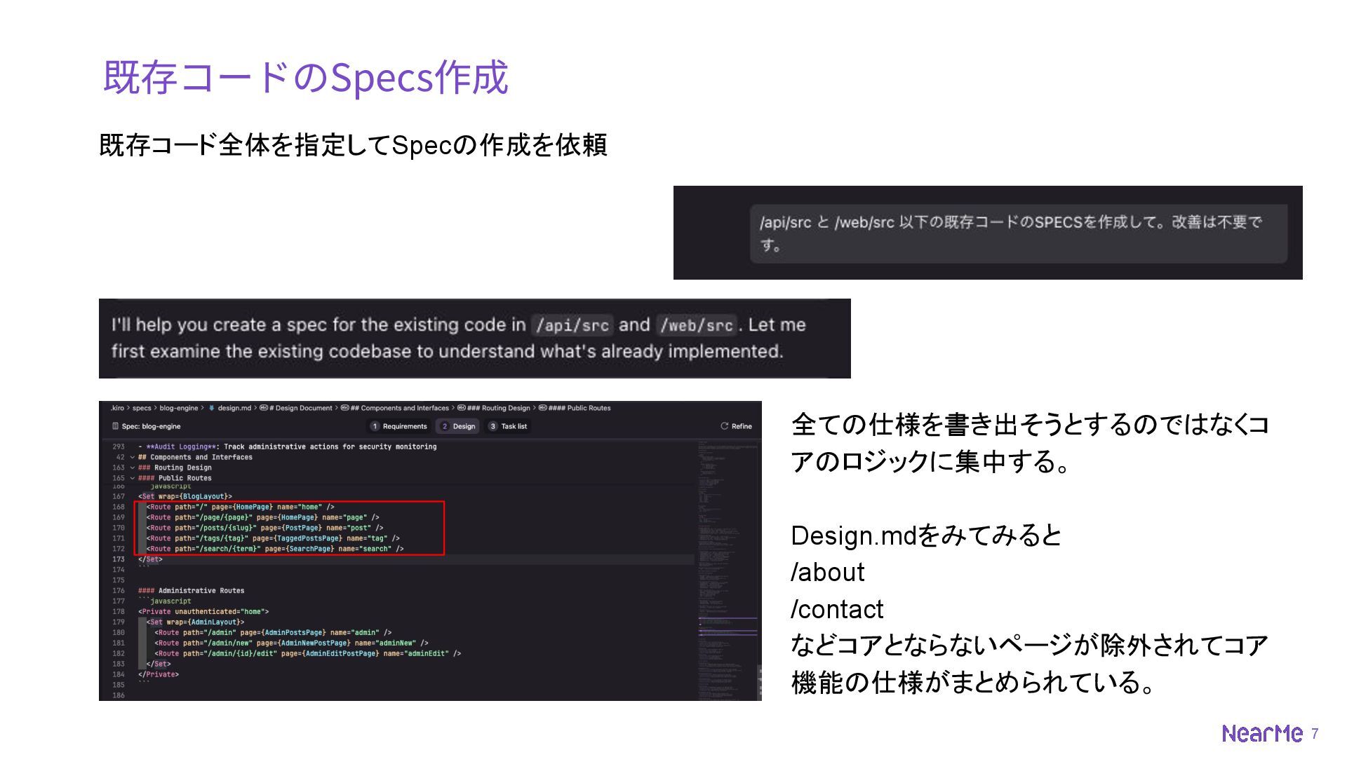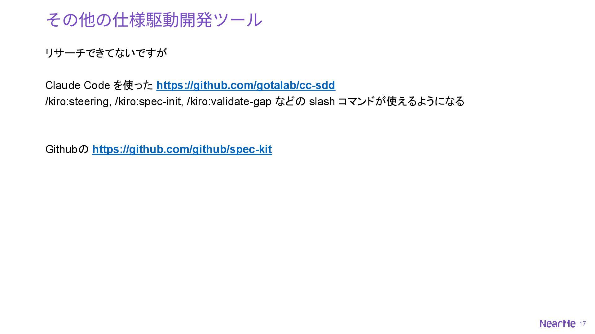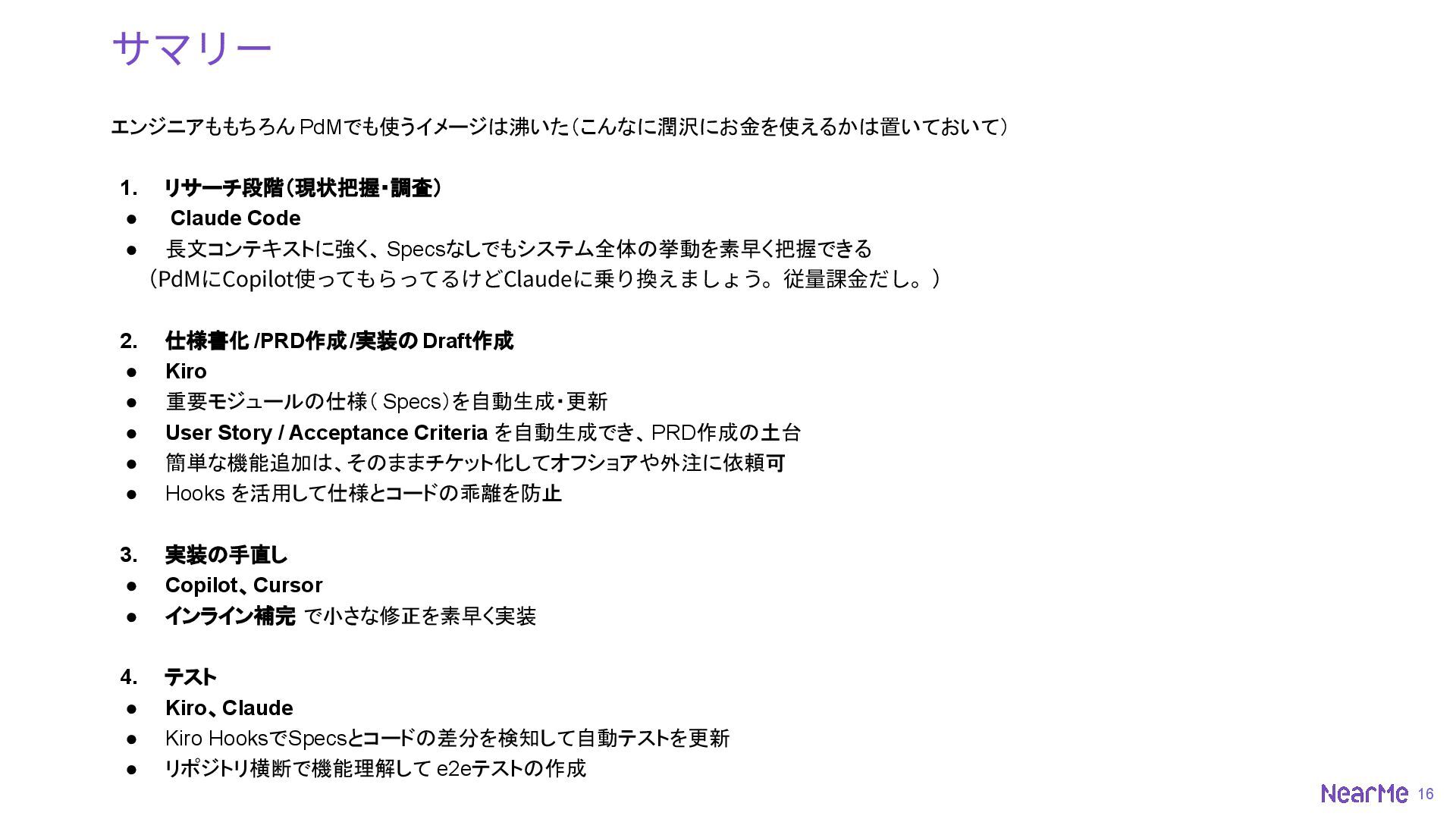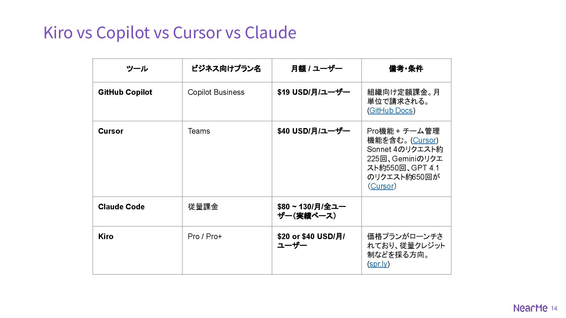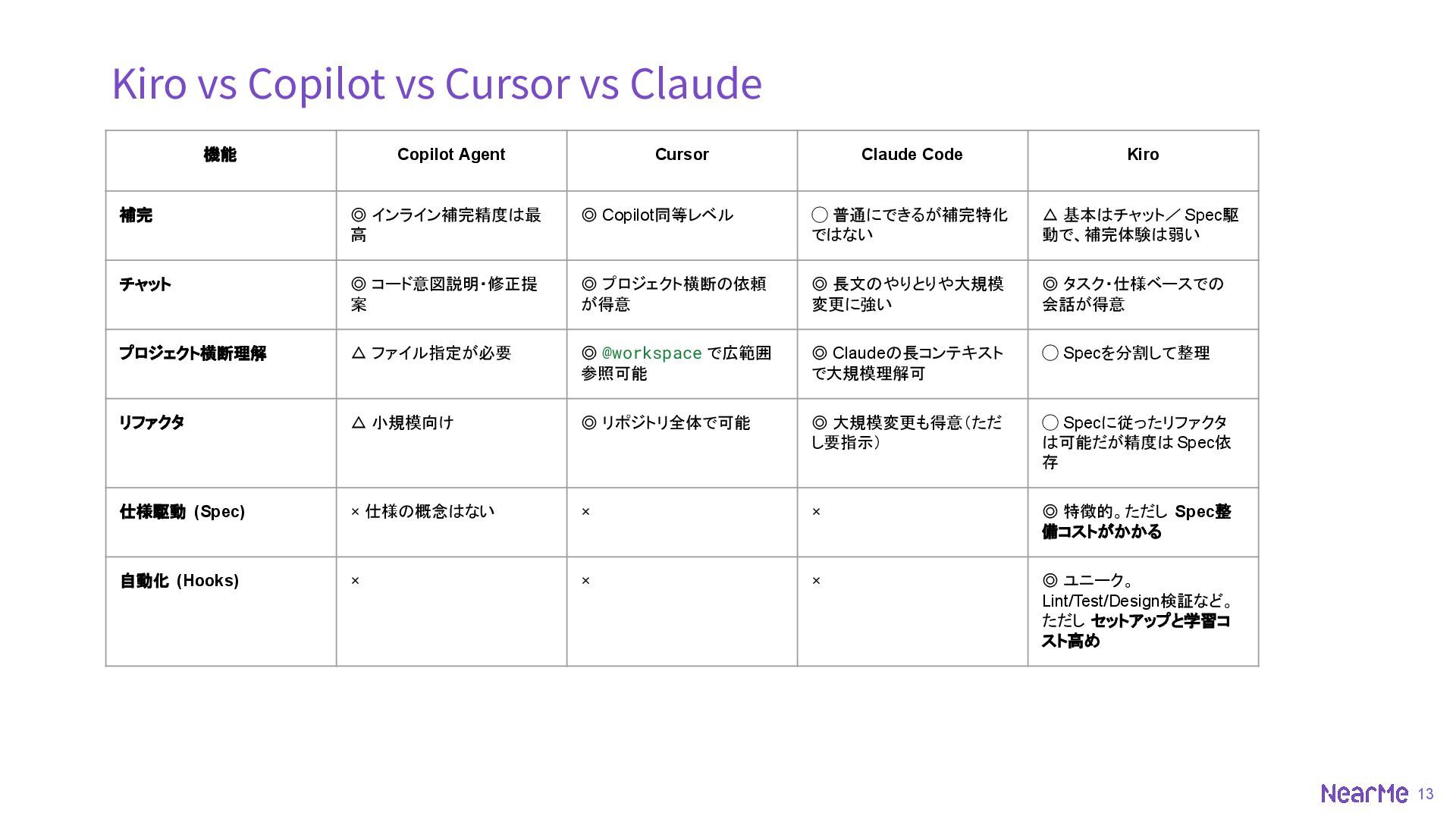 AWSが提唱する新しいIDE「Kiro」を実際に触ってみたハンズオン資料です。 「AI coding with spec-driven development」を掲げ、仕様書作成から実装・自動化までAIが支援するKiroの特徴や、Copilot・Cursor・Claudeとの比較、実際に試した際の課題や利点についてまとめています。 第131回NearMe技術勉強会(2025年9月25日)での発表資料。