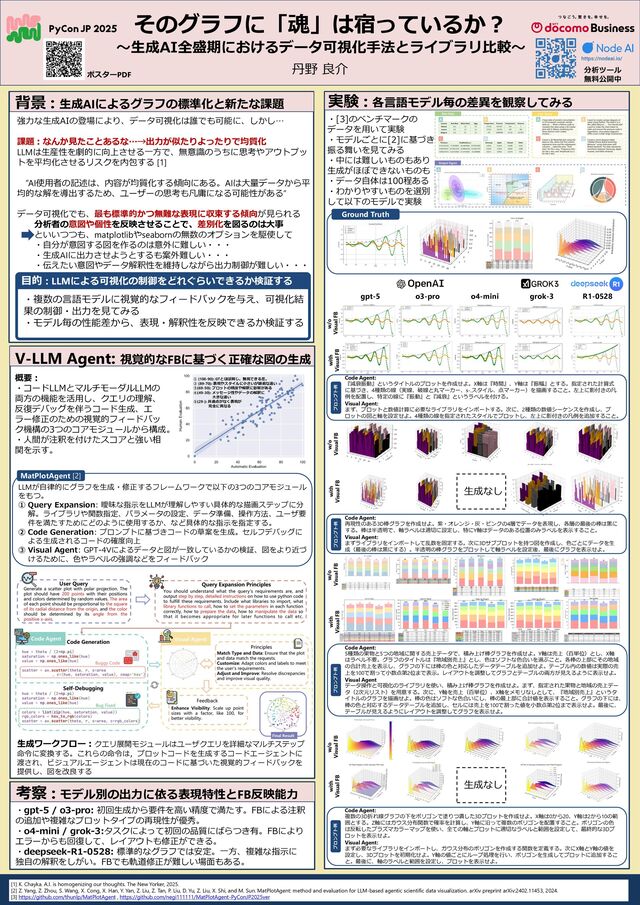 New Yorker, 2025. [2] Z. Yang, Z. Zhou, S. Wang, X. Cong, X. Han, Y. Yan, Z. Liu, Z. Tan, P. Liu, D. Yu, Z. Liu, X. Shi, and M. Sun. MatPlotAgent: method and evaluation for LLM-based agentic scientific data visualization. arXiv preprint arXiv:2402.11453, 2024. [3] https://github.com/thunlp/MatPlotAgent , https://github.com/negi111111/MatPlotAgent-PyConJP2025ver そのグラフに「魂」は宿っているか? ~生成AI全盛期におけるデータ可視化手法とライブラリ比較~ 丹野 良介 背景 : 生成AIによるグラフの標準化と新たな課題 実験 : 各言語モデル毎の差異を観察してみる 強力な生成AIの登場により、データ可視化は誰でも可能に、しかし… 課題:なんか見たことあるな…→出力が似たりよったりで均質化 LLMは生産性を劇的に向上させる一方で、無意識のうちに思考やアウトプッ トを平均化させるリスクを内包する [1] ”AI使用者の記述は、内容が均質化する傾向にある。AIは大量データから平 均的な解を導出するため、ユーザーの思考も凡庸になる可能性がある” データ可視化でも、最も標準的かつ無難な表現に収束する傾向が見られる 分析者の意図や個性を反映させることで、差別化を図るのは大事 といいつつも、matplotlibやseabornの無数のオプションを駆使して ・自分が意図する図を作るのは意外に難しい・・・ ・生成AIに出力させようとするも案外難しい・・・ ・伝えたい意図やデータ解釈性を維持しながら出力制御が難しい・・・ V-LLM Agent: 視覚的なFBに基づく正確な図の生成 LLMが自律的にグラフを生成・修正するフレームワークで以下の3つのコアモジュール をもつ。 ① Query Expansion: 曖昧な指示をLLMが理解しやすい具体的な描画ステップに分 解。ライブラリや関数指定、パラメータの設定、データ準備、操作方法、ユーザ要 件を満たすためにどのように使用するか、など具体的な指示を指定する。 ② Code Generation: プロンプトに基づきコードの草案を生成。セルフデバッグに よる生成されるコードの確度向上 ③ Visual Agent: GPT-4Vによるデータと図が一致しているかの検証、図をより近づ けるために、色やラベルの強調などをフィードバック MatPlotAgent [2] 目的 : LLMによる可視化の制御をどれぐらいできるか検証する gpt-5 o3-pro o4-mini grok-3 R1-0528 w/o Visual FB with Visual FB Code Agent: 『減衰振動』というタイトルのプロットを作成せよ。X軸は『時間』、Y軸は『振幅』とする。指定された計算式 に基づき、4種類の線(実線、破線と丸マーカー、s-.スタイル、点マーカー)を描画すること。左上に影付きの凡 例を配置し、特定の線に『振動』と『減衰』というラベルを付ける。 Visual Agent: まず、プロットと数値計算に必要なライブラリをインポートする。次に、2種類の数値シーケンスを作成し、プ ロットの図と軸を設定せよ。4種類の線を指定されたスタイルでプロットし、左上に影付きの凡例を追加すること。 軸ラベルとタイトルを設定した後、最後にプロットを表示せよ。 Code Agent: 5種類の果物と5つの地域に関する売上データで、積み上げ棒グラフを作成せよ。Y軸は売上(百単位)とし、X軸 はラベル不要。グラフのタイトルは『地域別売上』とし、色はソフトな色合いを選ぶこと。各棒の上部にその地域 の合計売上を表示し、グラフの下には棒の色と対応したデータテーブルを追加せよ。テーブル内の数値は実際の売 上を100で割って小数点第2位まで表示。レイアウトを調整してグラフとテーブルの両方が見えるように表示せよ。 Visual Agent データ操作と可視化のライブラリを使い、積み上げ棒グラフを作成せよ。まず、指定された果物と地域の売上デー タ(2次元リスト)を用意する。次に、Y軸を売上(百単位)、X軸をメモリなしとして、『地域別売上』というタ イトルのグラフを描画せよ。棒の色はソフトな色合いにし、棒の最上部に合計値を表示すること。グラフの下には、 棒の色と対応するデータテーブルを追加し、セルには売上を100で割った値を小数点第2位まで表示せよ。最後に、 テーブルが見えるようにレイアウトを調整してグラフを表示せよ。 Code Agent: 複数の3D折れ線グラフの下をポリゴンで塗りつ潰した3Dプロットを作成せよ。X軸は0から20、Y軸は2から10の範 囲とする。Z軸にはガウス分布関数で確率を計算し、Y軸に沿って複数のポリゴンを配置すること。ポリゴンの色 は反転したプラズマカラーマップを使い、全ての軸とプロットに適切なラベルと範囲を設定して、最終的な3Dプ ロットを表示せよ。 Visual Agent: まず必要なライブラリをインポートし、ガウス分布のポリゴンを作成する関数を定義する。次にX軸とY軸の値を 設定し、3Dプロットを初期化せよ。Y軸の値ごとにループ処理を行い、ポリゴンを生成してプロットに追加するこ と。最後に、軸のラベルと範囲を設定し、プロットを表示せよ。 Ground Truth Code Agent: 再現性のある3D棒グラフを作成せよ。紫・オレンジ・灰・ピンクの4層でデータを表現し、各層の最後の棒は黒に する。棒は半透明で、軸ラベルは適切に設定し、特にY軸はデータのある位置のみラベルを表示するこ