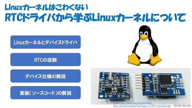 Linuxカーネルはこわくない RTCドライバから学ぶLinuxカーネルについて https://en.wikipedia.org/wiki/Real- time_clock#/media/File:Types_of_RTC_modules.jpg /CC BY-SA 4.0) Linuxカーネルとデバイスドライバ RTCの役割 実装(ソースコード)の解説