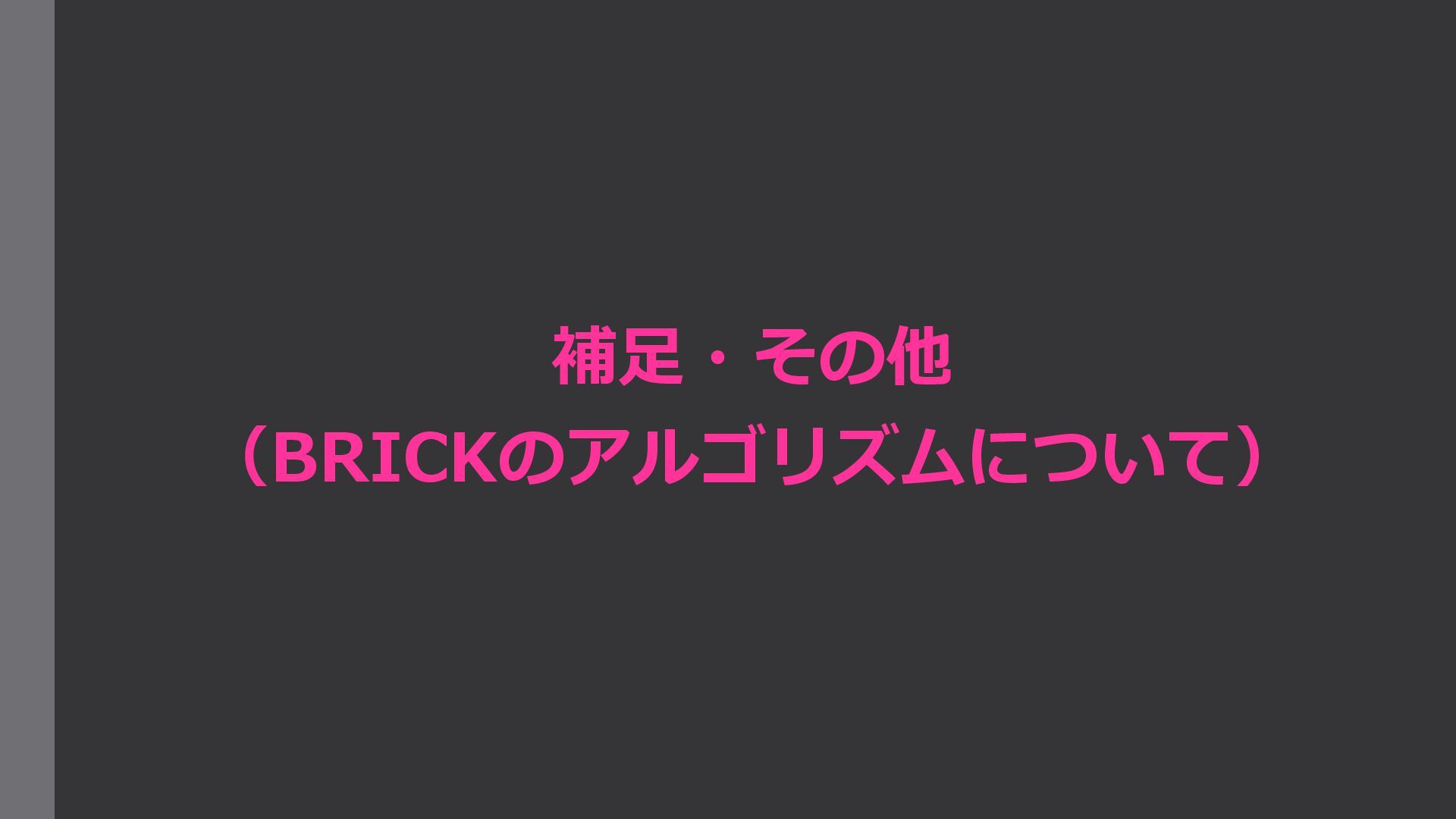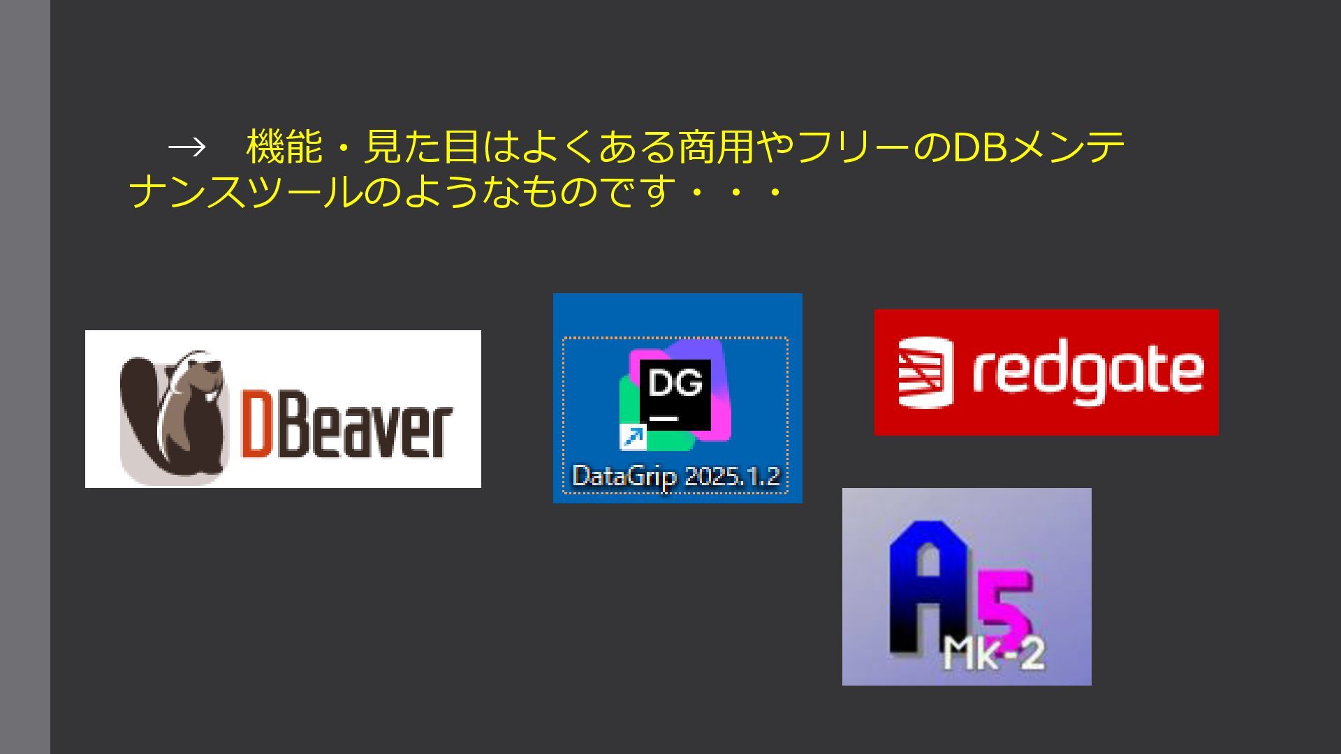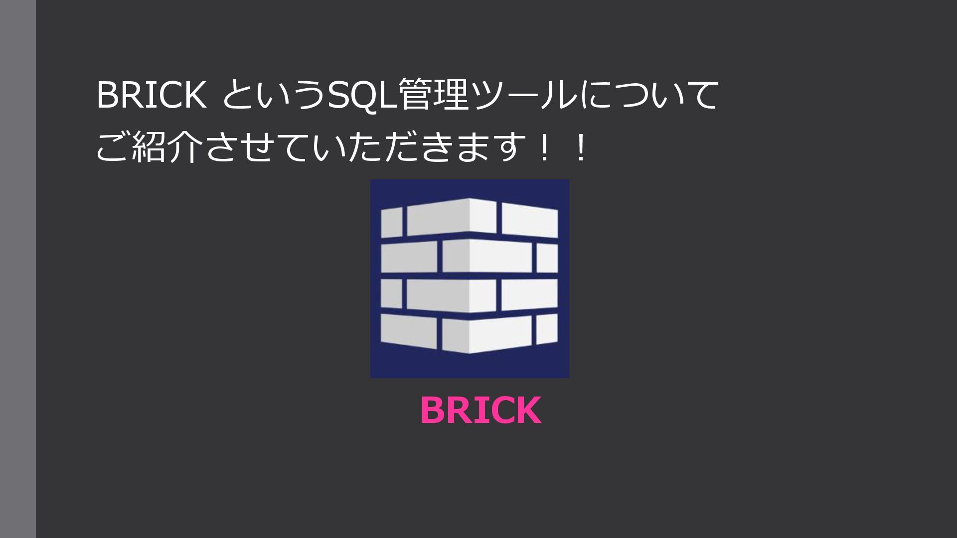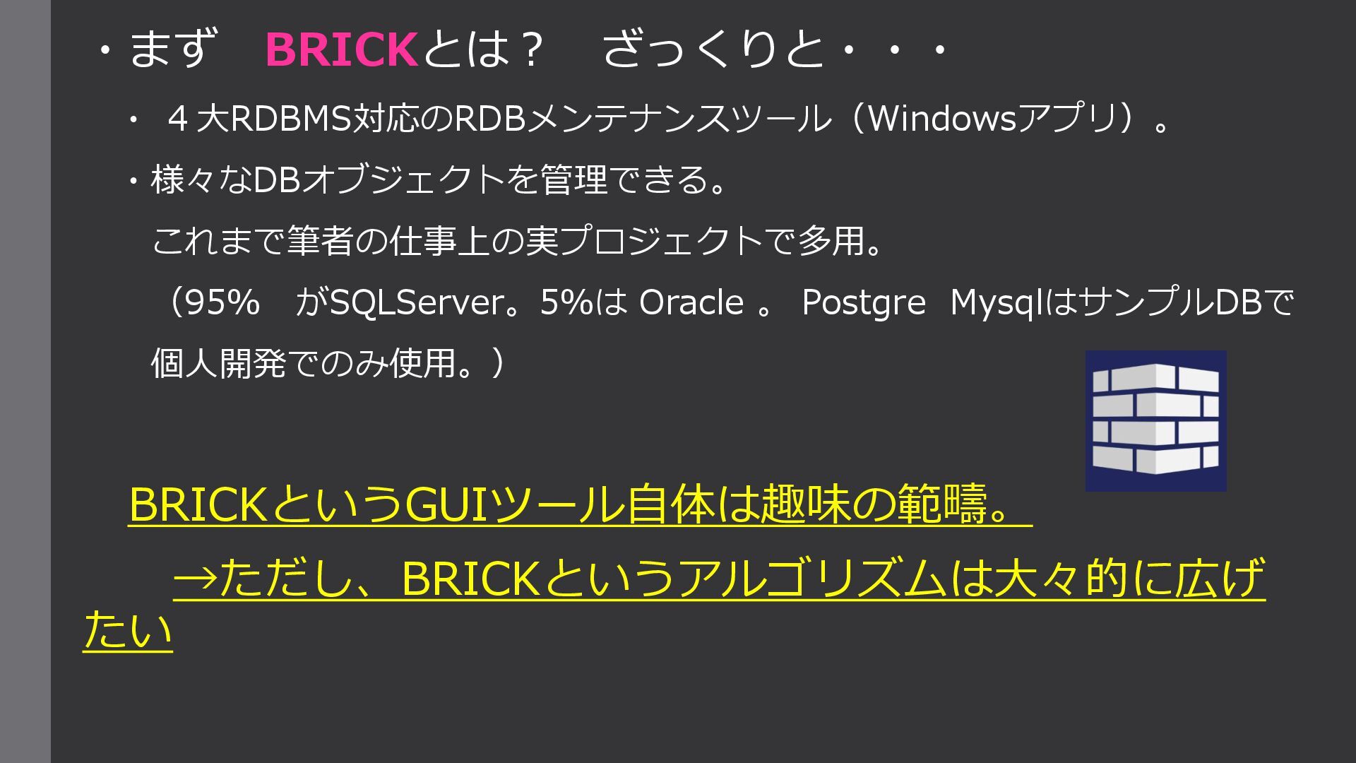 。 Postgre MysqlはサンプルDBで 個人開発でのみ使用。) BRICKというGUIツール自体は趣味の範疇。 →ただし、BRICKというアルゴリズムは大々的に広げ たい