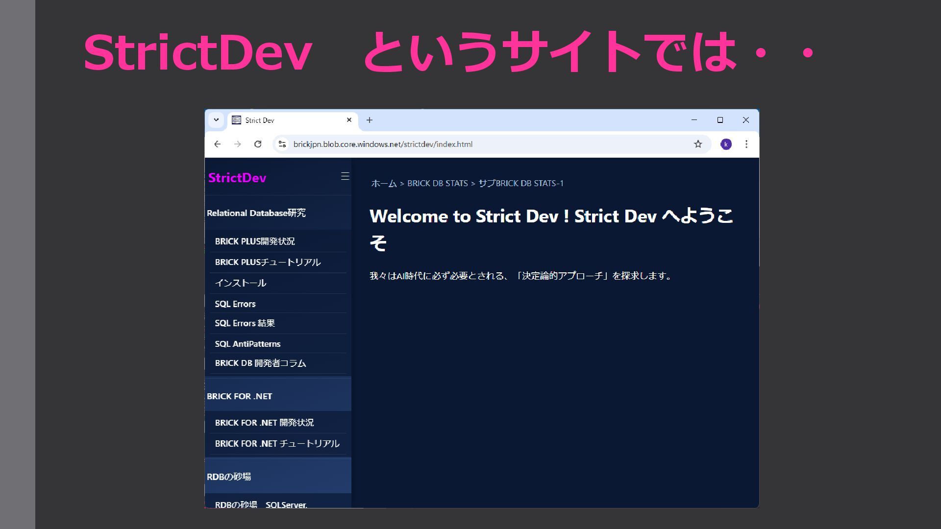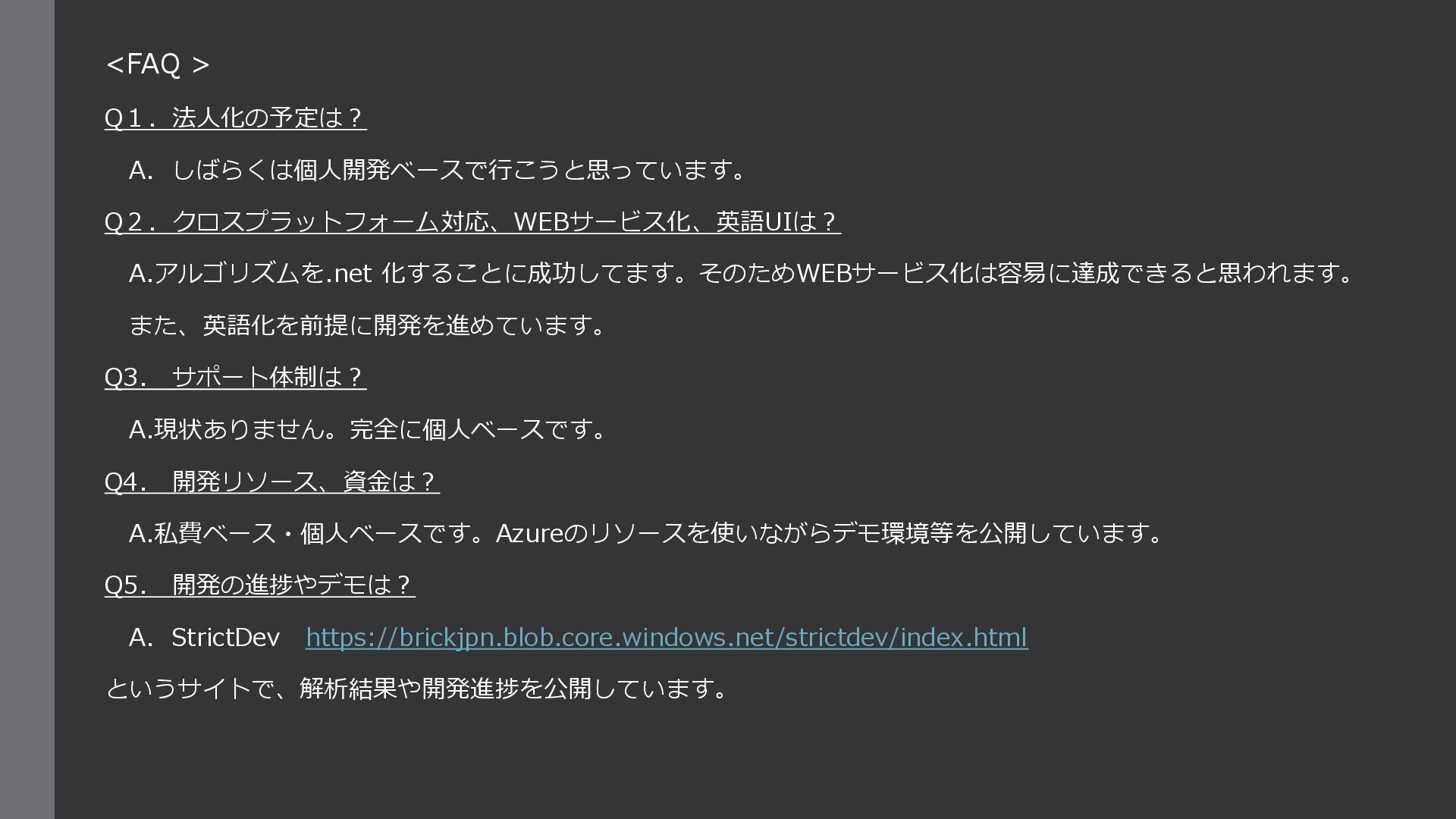 サポート体制は? A.現状ありません。完全に個人ベースです。 Q4. 開発リソース、資金は? A.私費ベース・個人ベースです。Azureのリソースを使いながらデモ環境等を公開しています。 Q5. 開発の進捗やデモは? A. StrictDev https://brickjpn.blob.core.windows.net/strictdev/index.html というサイトで、解析結果や開発進捗を公開しています。