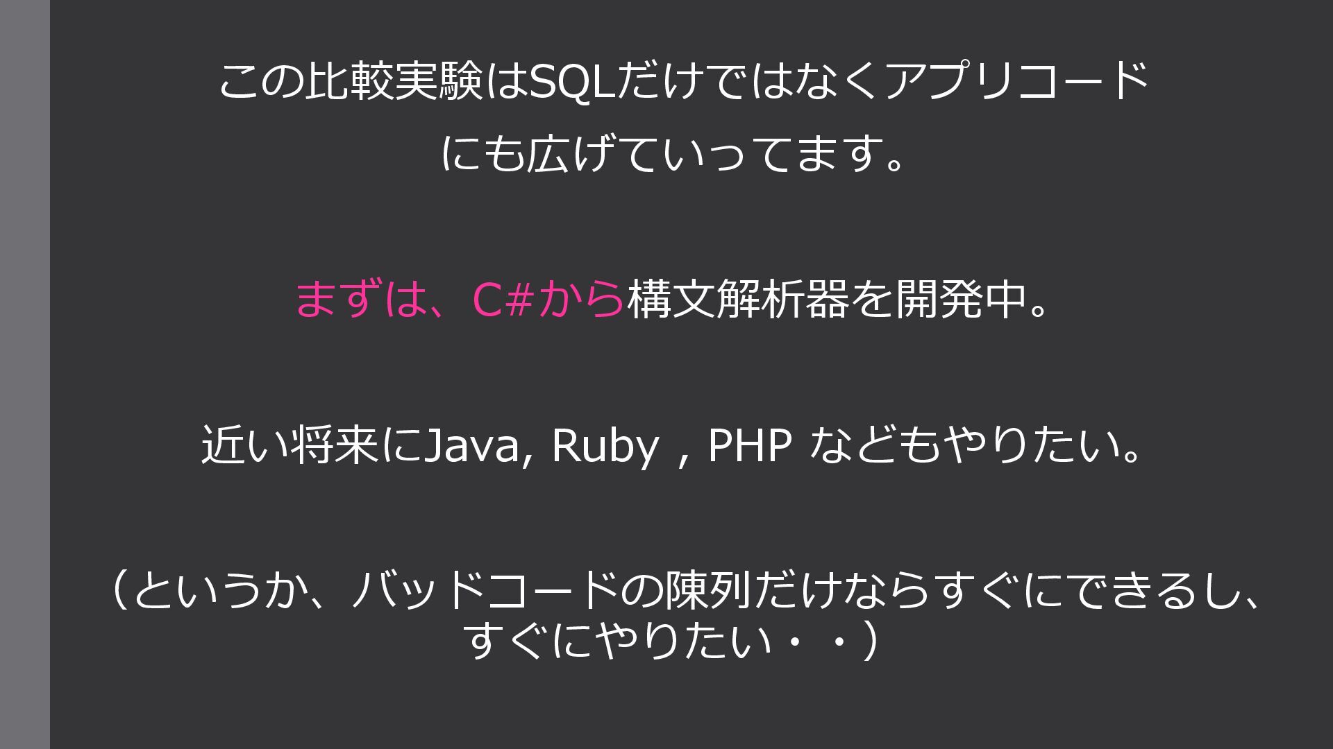 ) → ストアドやバッチ処理の多いSier系に 確実な潜在ニーズあり。 ・ INSERT / UPDATE文のテーブルアクセス順を解析 → デッドロックの発生要因となる テーブルアクセス箇所を言い当てる。そして修正提案。 ・アンチパターンを解析で検知し、その解決となる実装方針を複数提案 例:Ambiguous Group → 様々なスメルをパターン分けして、最適な修正の 選択肢を提示するなど。 ・エディタ上で書きながら問題点を即時フィードバック (GUIツールの良さ ※Windows限定) ・DBMSが出してくるエラーメッセージよりも豊富なエラー箇所の特定 ・リファクタリング支援: 例えば、とあるテーブルの列の削除や属性変更が全体にどう影響する か、瞬時にシミュレーションできる。 DBリファクタリングを行う開発者のデグレードの不安を解消。
