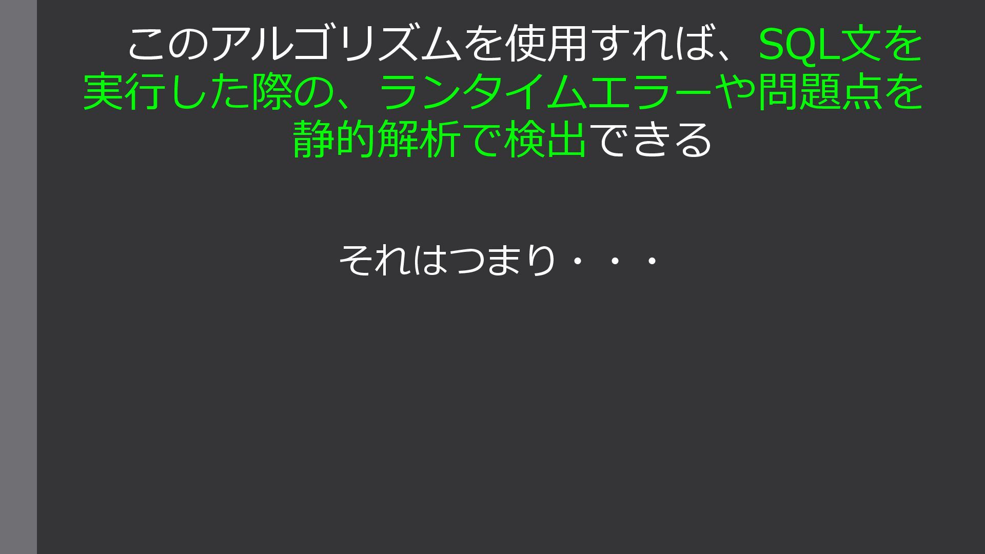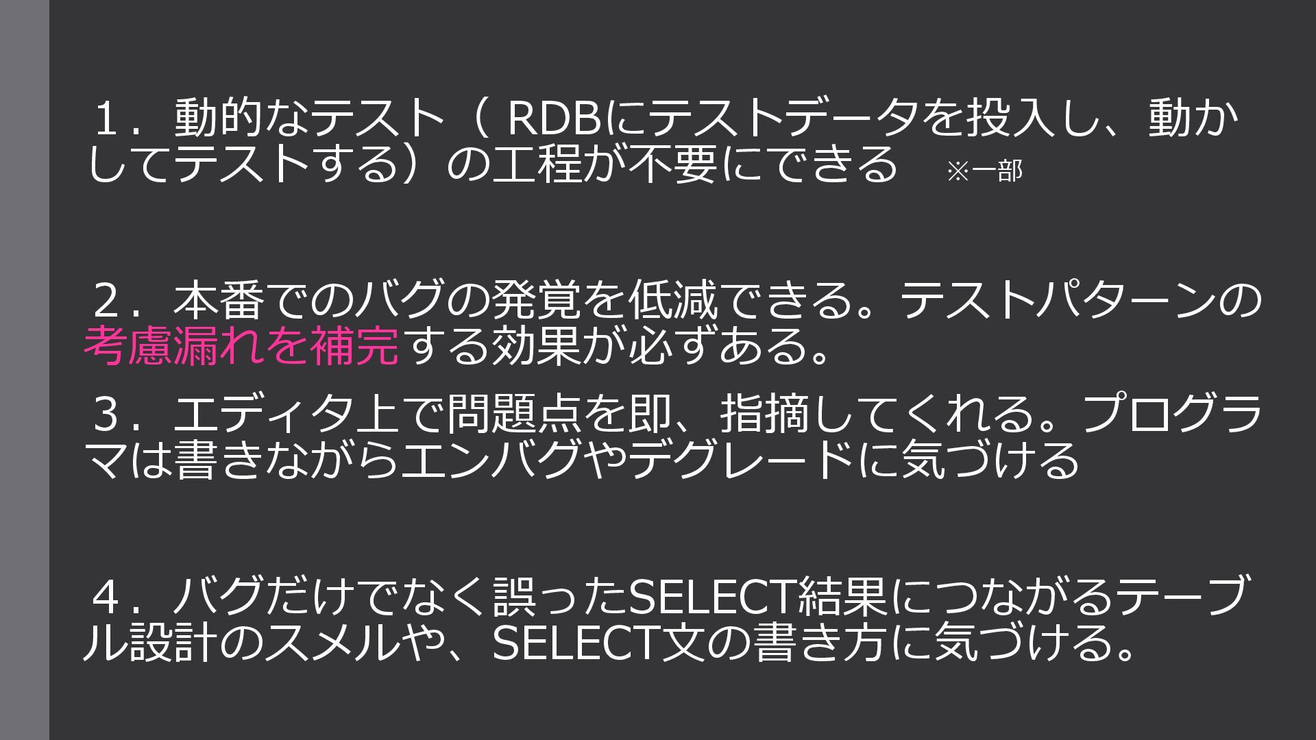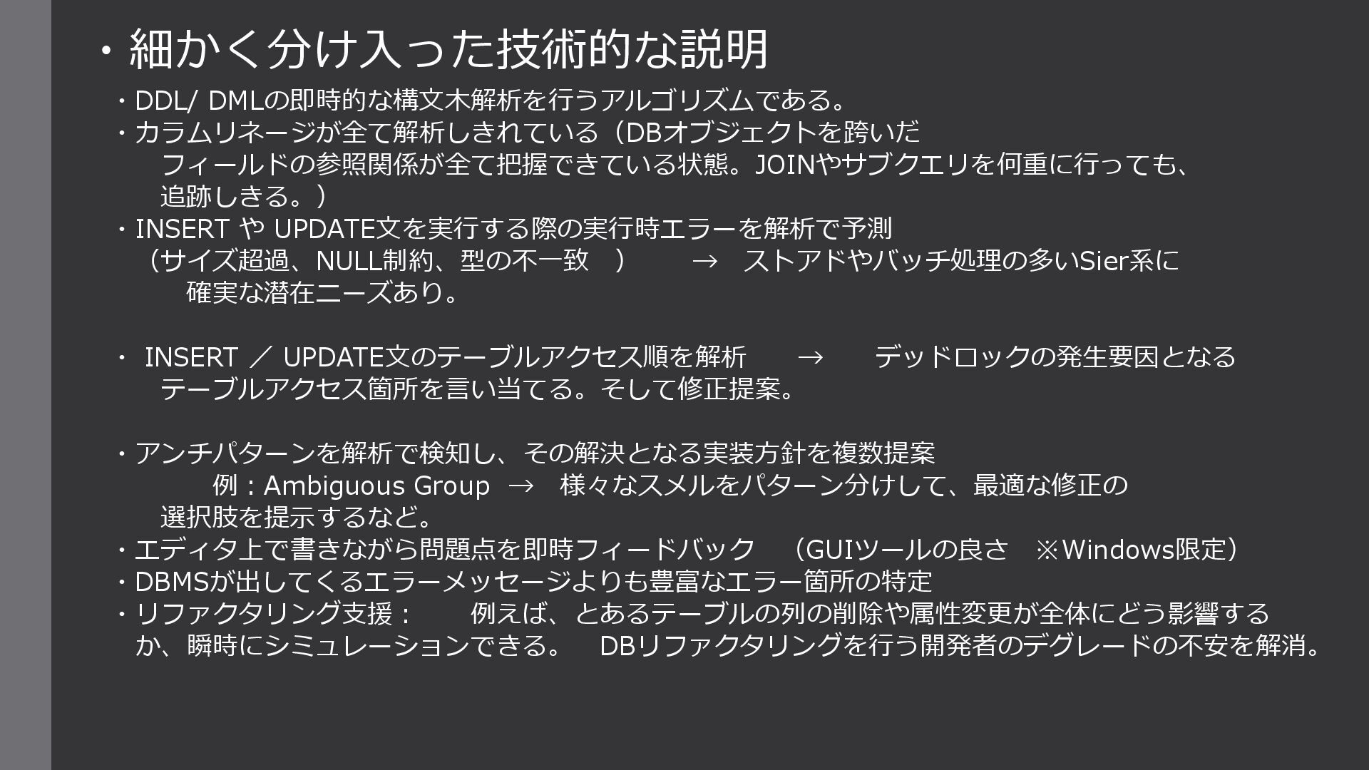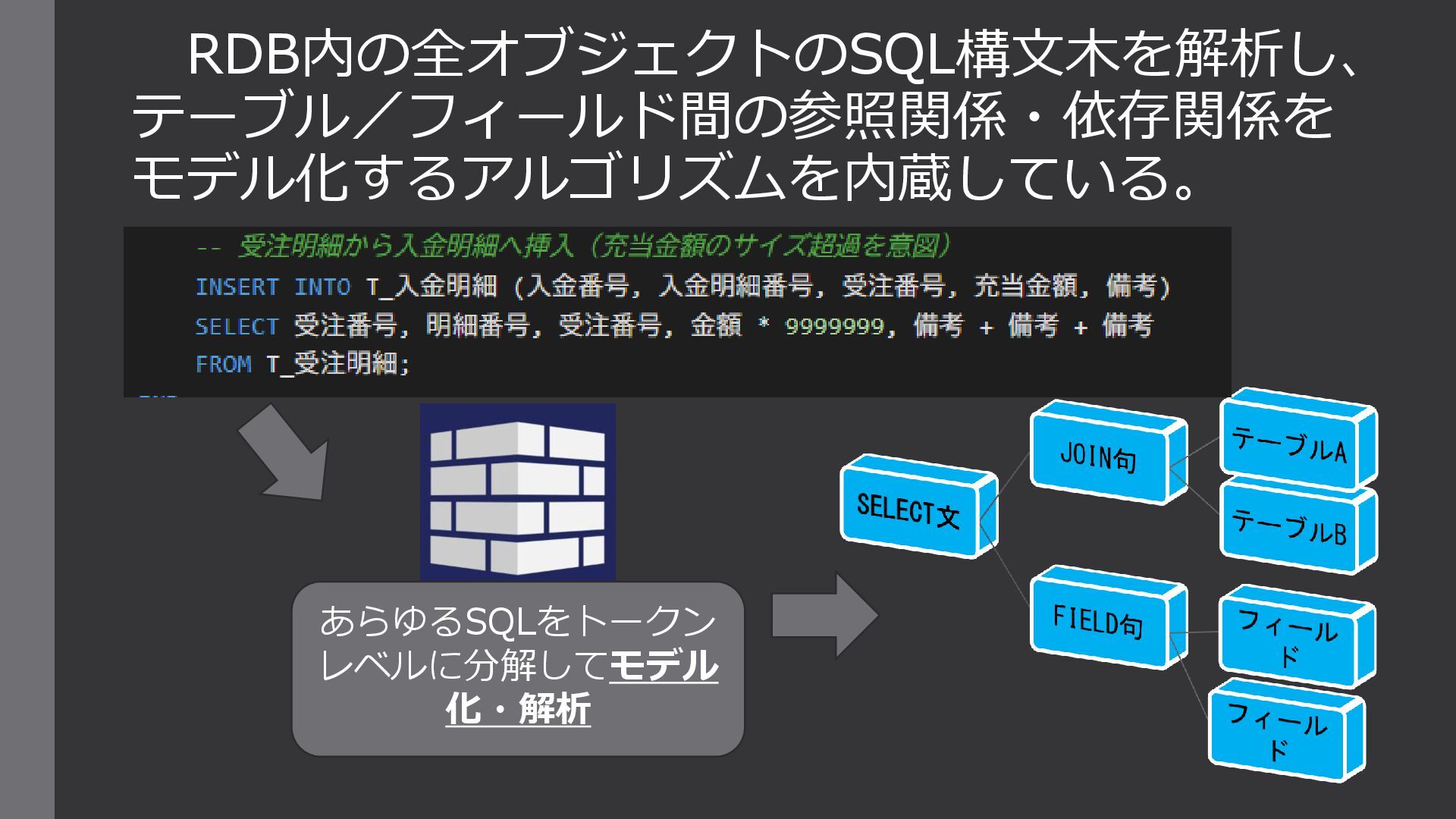 3. ・細かく分け入った技術的な説明 ・DDL/ DMLの即時的な構文木解析を行うアルゴリズムである。 ・カラムリネージが全て解析しきれている(DBオブジェクトを跨いだ フィールドの参照関係が全て把握できている状態。JOINやサブクエリを何重に行っても、 追跡しきる。) ・INSERT や UPDATE文を実行する際の実行時エラーを解析で予測 (サイズ超過、NULL制約、型の不一致