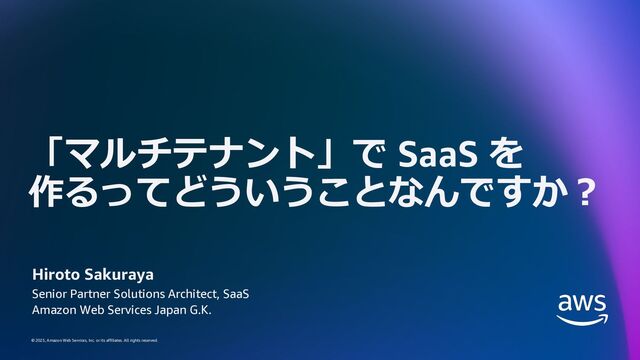 rights reserved. SaaS を作るとはどういうことか ü システムにテナントの概念を導⼊し、セキュリティ、パフォーマン ス、可⽤性、コスト、運⽤など、さまざまな観点からテナントが もたらす課題に取り組み、効率的にテナントを取り扱えるようにす ること。 ü それでも、開発者にテナントの存在を意識させないようにすること。 ü テナントをすべての考慮事項の中⼼に置き、データドリブンで意思 決定ができるようにすること。その根拠となるオブザーバビリティ をテナントレベルで確保すること。
