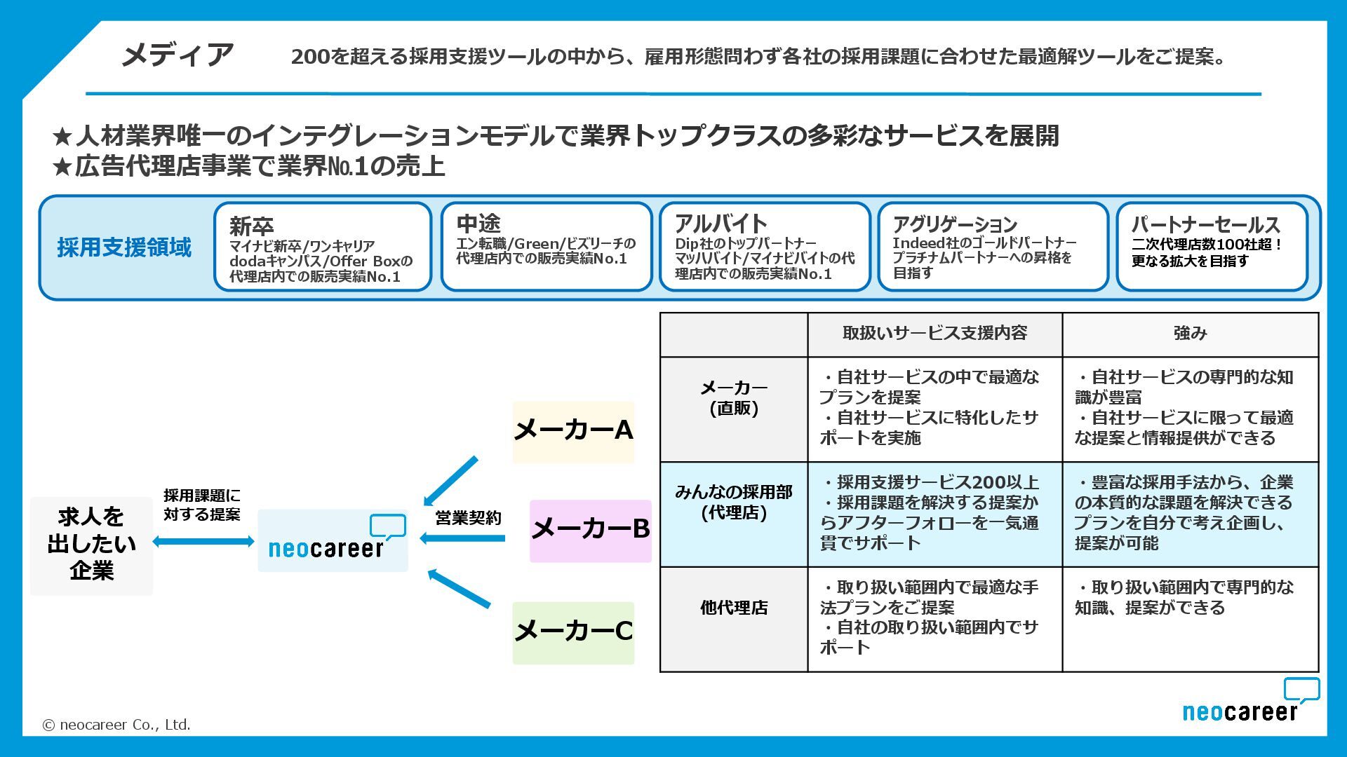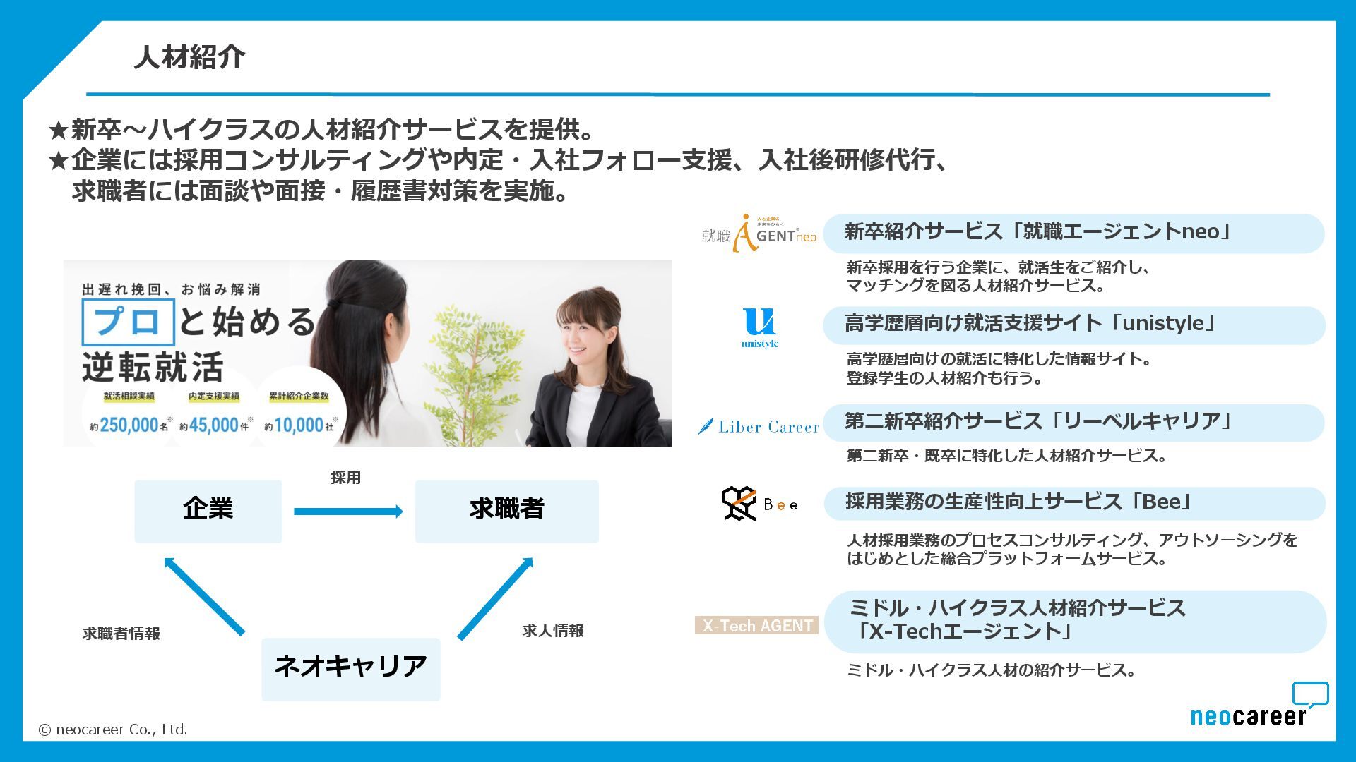 登録学生の人材紹介も行う。 第二新卒・既卒に特化した人材紹介サービス。 人材採用業務のプロセスコンサルティング、アウトソーシングを はじめとした総合プラットフォームサービス。 ミドル・ハイクラス人材の紹介サービス。 ★新卒~ハイクラスの人材紹介サービスを提供。 ★企業には採用コンサルティングや内定・入社フォロー支援、入社後研修代行、 求職者には面談や面接・履歴書対策を実施。 企業 求職者 ネオキャリア 採用 求人情報 求職者情報 © neocareer Co., Ltd.