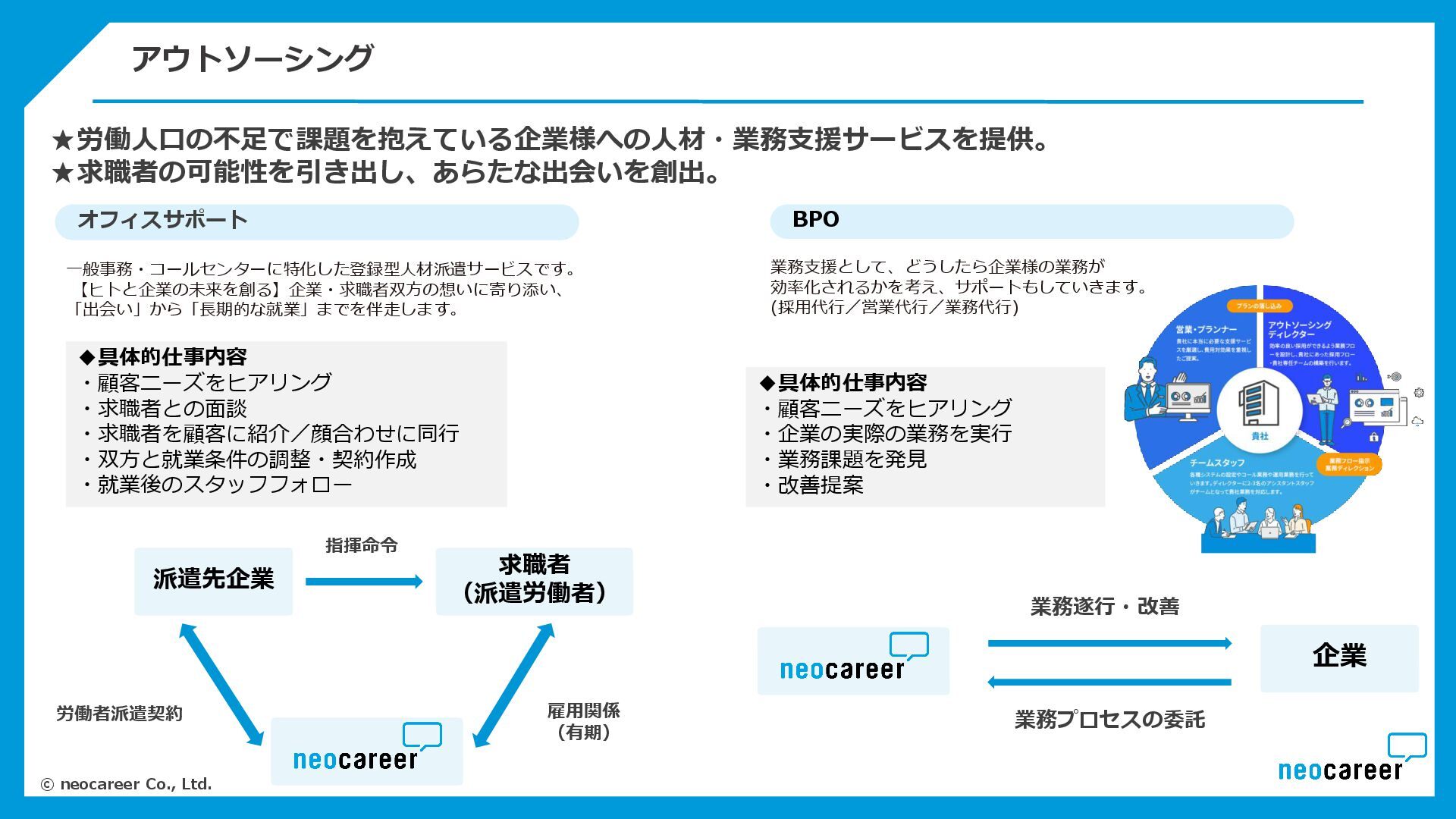 (派遣労働者) 指揮命令 雇用関係 (有期) 労働者派遣契約 © neocareer Co., Ltd. オフィスサポート ◆具体的仕事内容 ・顧客ニーズをヒアリング ・求職者との面談 ・求職者を顧客に紹介/顔合わせに同行 ・双方と就業条件の調整・契約作成 ・就業後のスタッフフォロー ★労働人口の不足で課題を抱えている企業様への人材・業務支援サービスを提供。 ★求職者の可能性を引き出し、あらたな出会いを創出。 企業 業務プロセスの委託 業務遂行・改善 ◆具体的仕事内容 ・顧客ニーズをヒアリング ・企業の実際の業務を実行 ・業務課題を発見 ・改善提案