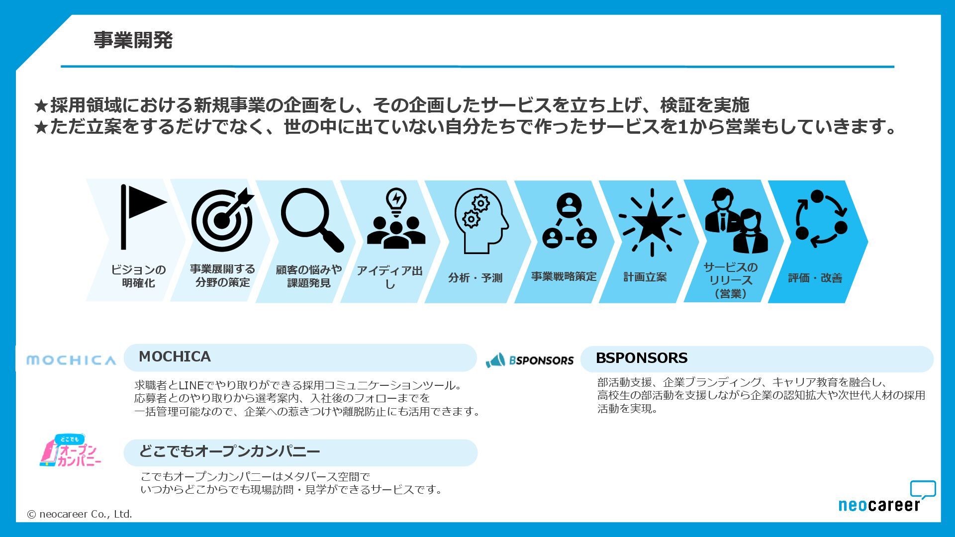高校生の部活動を支援しながら企業の認知拡大や次世代人材の採用 活動を実現。 © neocareer Co., Ltd. ★採用領域における新規事業の企画をし、その企画したサービスを立ち上げ、検証を実施 ★ただ立案をするだけでなく、世の中に出ていない自分たちで作ったサービスを1から営業もしていきます。 ビジョンの 明確化 事業展開する 分野の策定 顧客の悩みや 課題発見 分析・予測 事業戦略策定 計画立案 サービスの リリース (営業) 評価・改善 アイディア出 し
