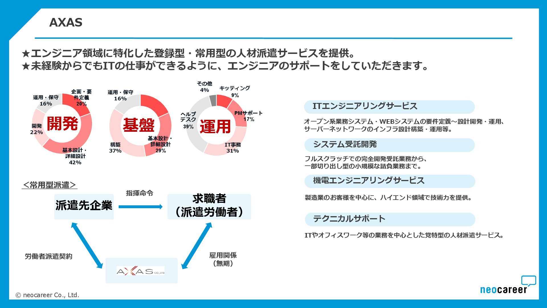 9. ITエンジニアリングサービス システム受託開発 オープン系業務システム・WEBシステムの要件定義~設計開発・運用、 サーバーネットワークのインフラ設計構築・運用等。 フルスクラッチでの完全開発受託業務から、 一部切り出し型の小規模な請負業務まで。 AXAS ★エンジニア領域に特化した登録型・常用型の人材派遣サービスを提供。 ★未経験からでもITの仕事ができるように、エンジニアのサポートをしていただきます。 開発