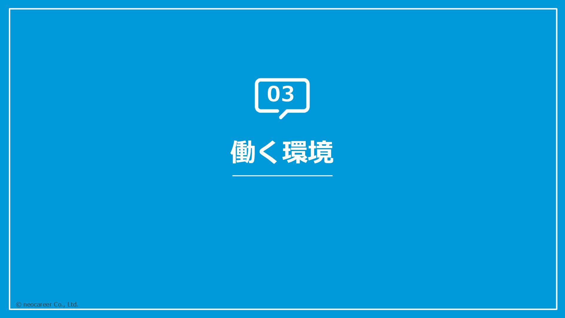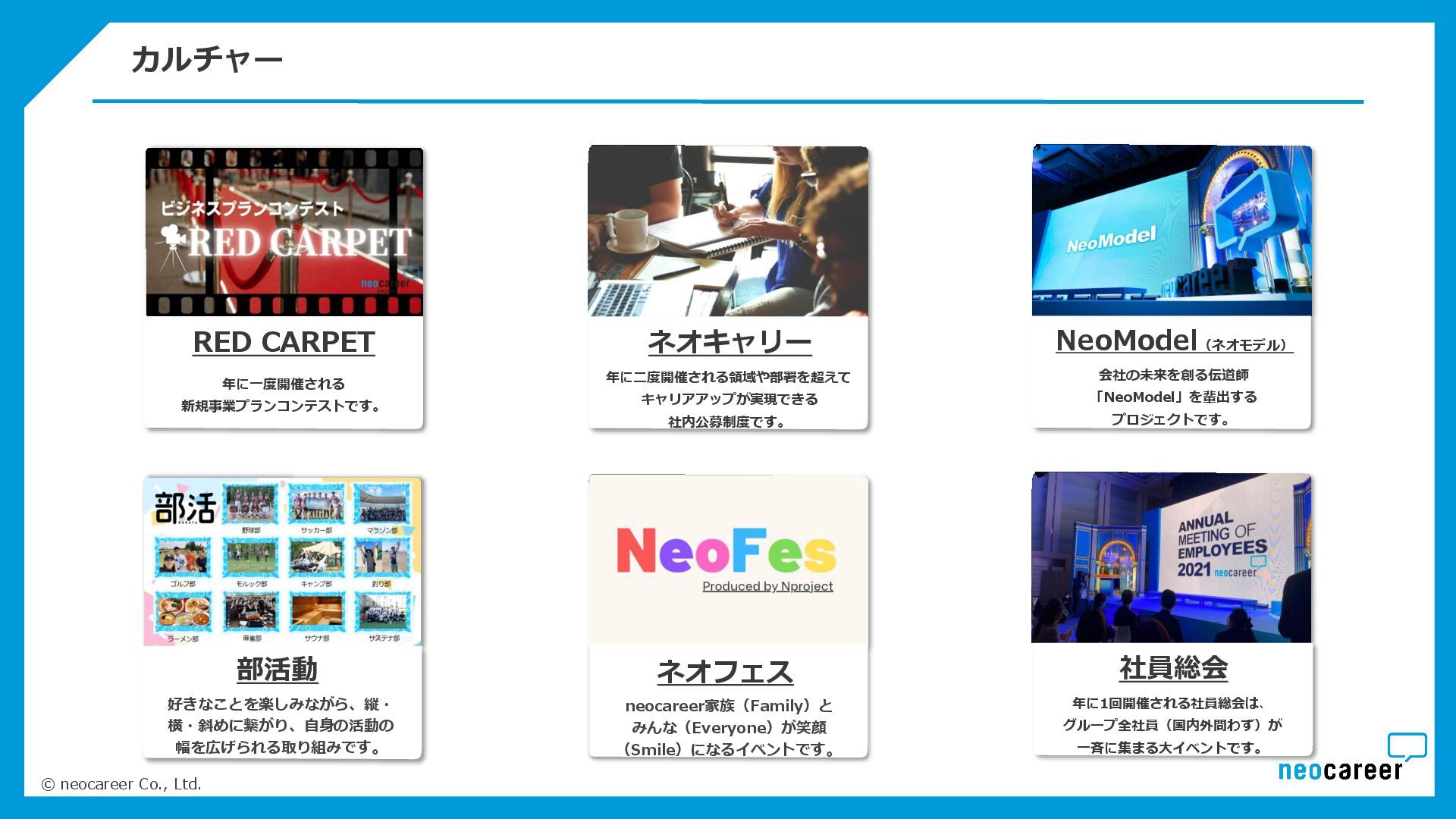 好きなことを楽しみながら、縦・ 横・斜めに繋がり、自身の活動の 幅を広げられる取り組みです。 部活動 NeoModel(ネオモデル) 会社の未来を創る伝道師 「NeoModel」を輩出する プロジェクトです。 ネオキャリー 年に二度開催される領域や部署を超えて キャリアアップが実現できる 社内公募制度です。 RED CARPET 年に一度開催される 新規事業プランコンテストです。 カルチャー © neocareer Co., Ltd.