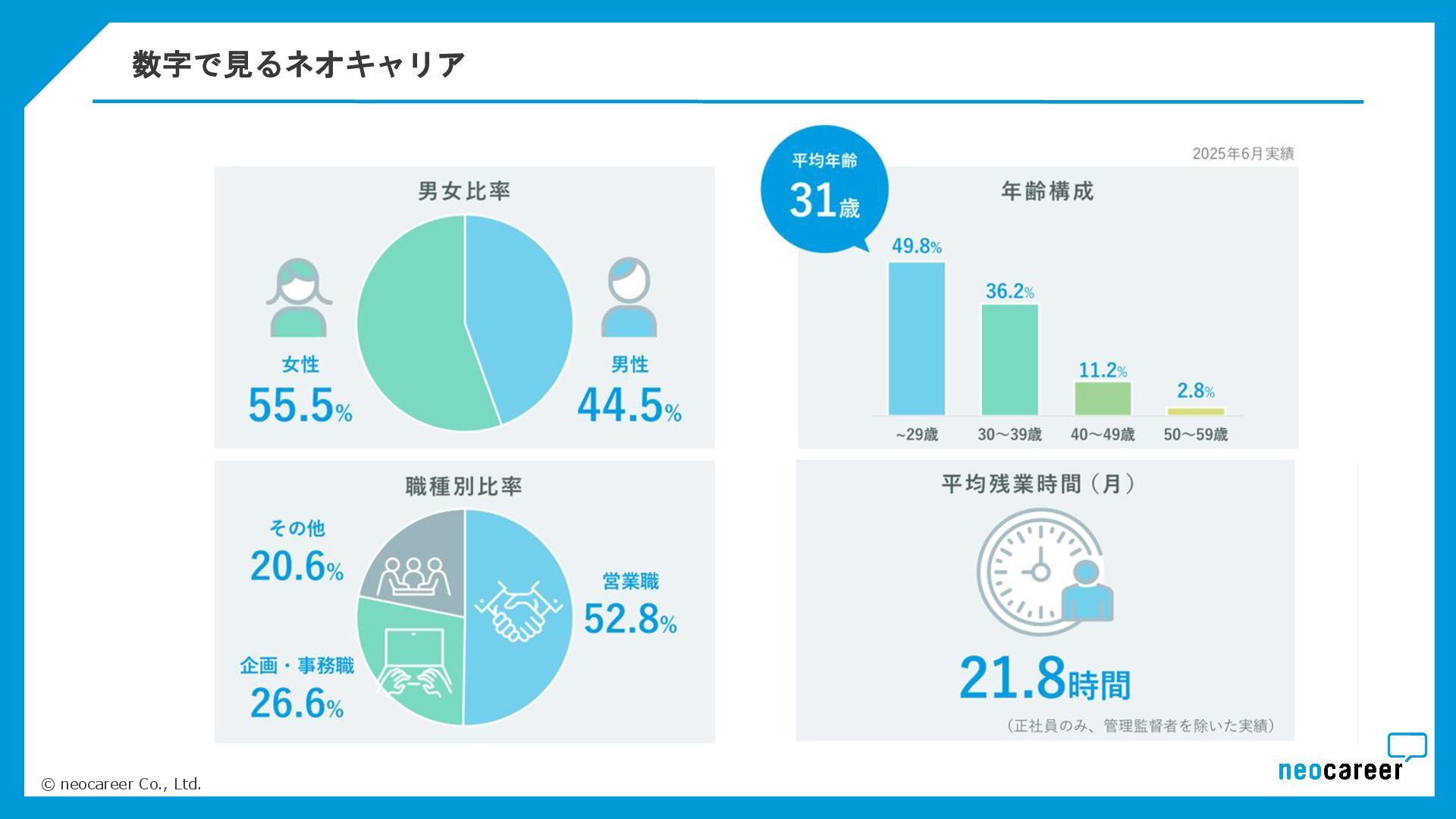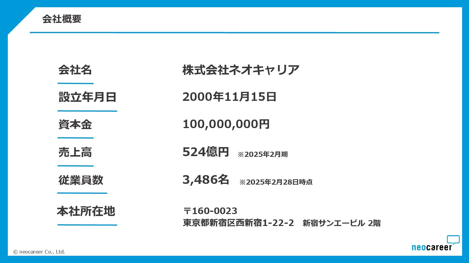 本社所在地 売上高 株式会社ネオキャリア 2000年11月15日 524億円 ※2025年2月期 100,000,000円 〒160-0023 東京都新宿区西新宿1-22-2 新宿サンエービル 2階 3,486名 ※2025年2月28日時点