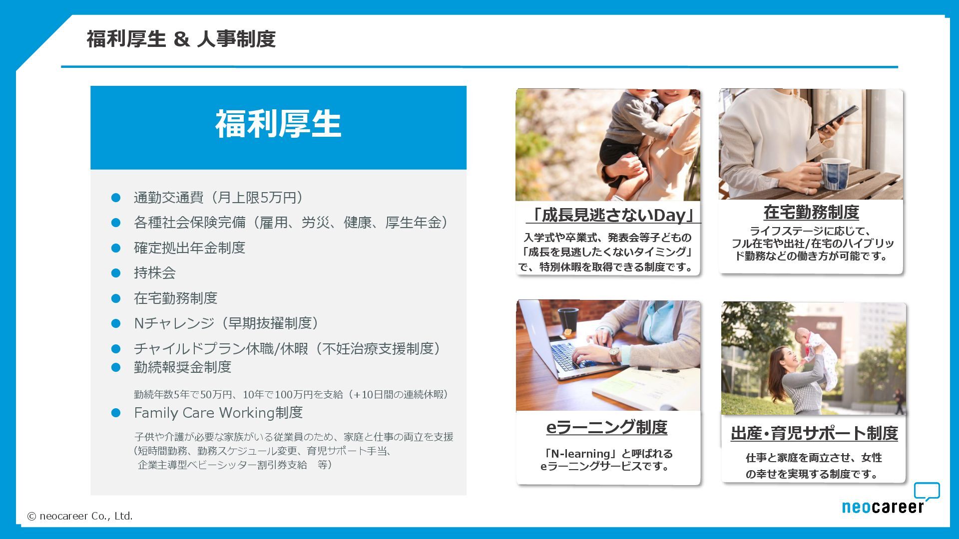 通勤交通費(月上限5万円) • 各種社会保険完備(雇用、労災、健康、厚生年金) • 確定拠出年金制度 • 持株会 • 在宅勤務制度 • Nチャレンジ(早期抜擢制度) • チャイルドプラン休職/休暇(不妊治療支援制度) • 勤続報奨金制度 勤続年数5年で50万円、10年で100万円を支給(+10日間の連続休暇) • Family Care Working制度 子供や介護が必要な家族がいる従業員のため、家庭と仕事の両立を支援 (短時間勤務、勤務スケジュール変更、育児サポート手当、 企業主導型ベビーシッター割引券支給 等) 「成長見逃さないDay」 入学式や卒業式、発表会等子どもの 「成長を見逃したくないタイミング」 で、特別休暇を取得できる制度です。 在宅勤務制度 ライフステージに応じて、 フル在宅や出社/在宅のハイブリッ ド勤務などの働き方が可能です。 eラーニング制度 「N-learning」と呼ばれる eラーニングサービスです。 出産・育児サポート制度 仕事と家庭を両立させ、女性 の幸せを実現する制度です。 福利厚生