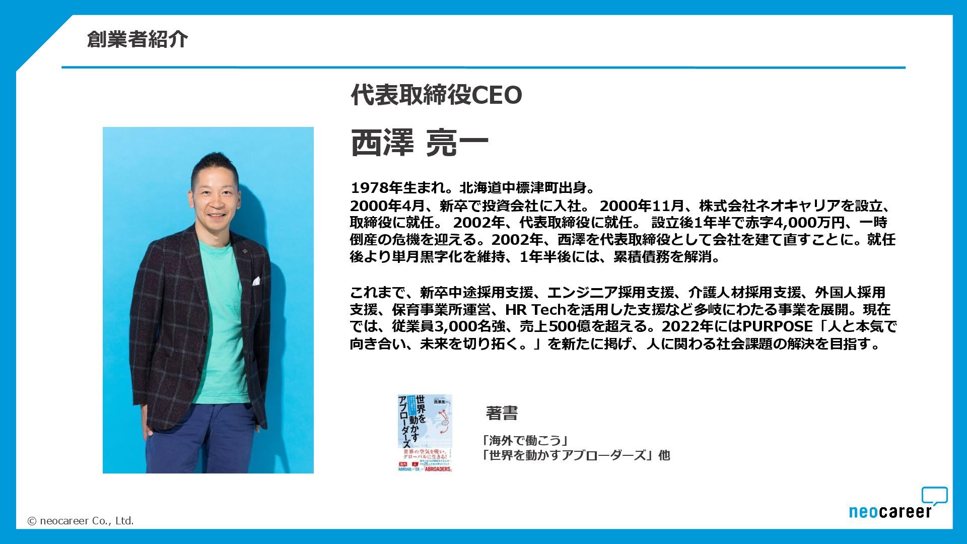 設立後1年半で赤字4,000万円、一時 倒産の危機を迎える。2002年、西澤を代表取締役として会社を建て直すことに。就任 後より単月黒字化を維持、1年半後には、累積債務を解消。 これまで、新卒中途採用支援、エンジニア採用支援、介護人材採用支援、外国人採用 支援、保育事業所運営、HR Techを活用した支援など多岐にわたる事業を展開。現在 では、従業員3,000名強、売上500億を超える。2022年にはPURPOSE「人と本気で 向き合い、未来を切り拓く。」を新たに掲げ、人に関わる社会課題の解決を目指す。 著書 「海外で働こう」 「世界を動かすアブローダーズ」他 創業者紹介 © neocareer Co., Ltd.