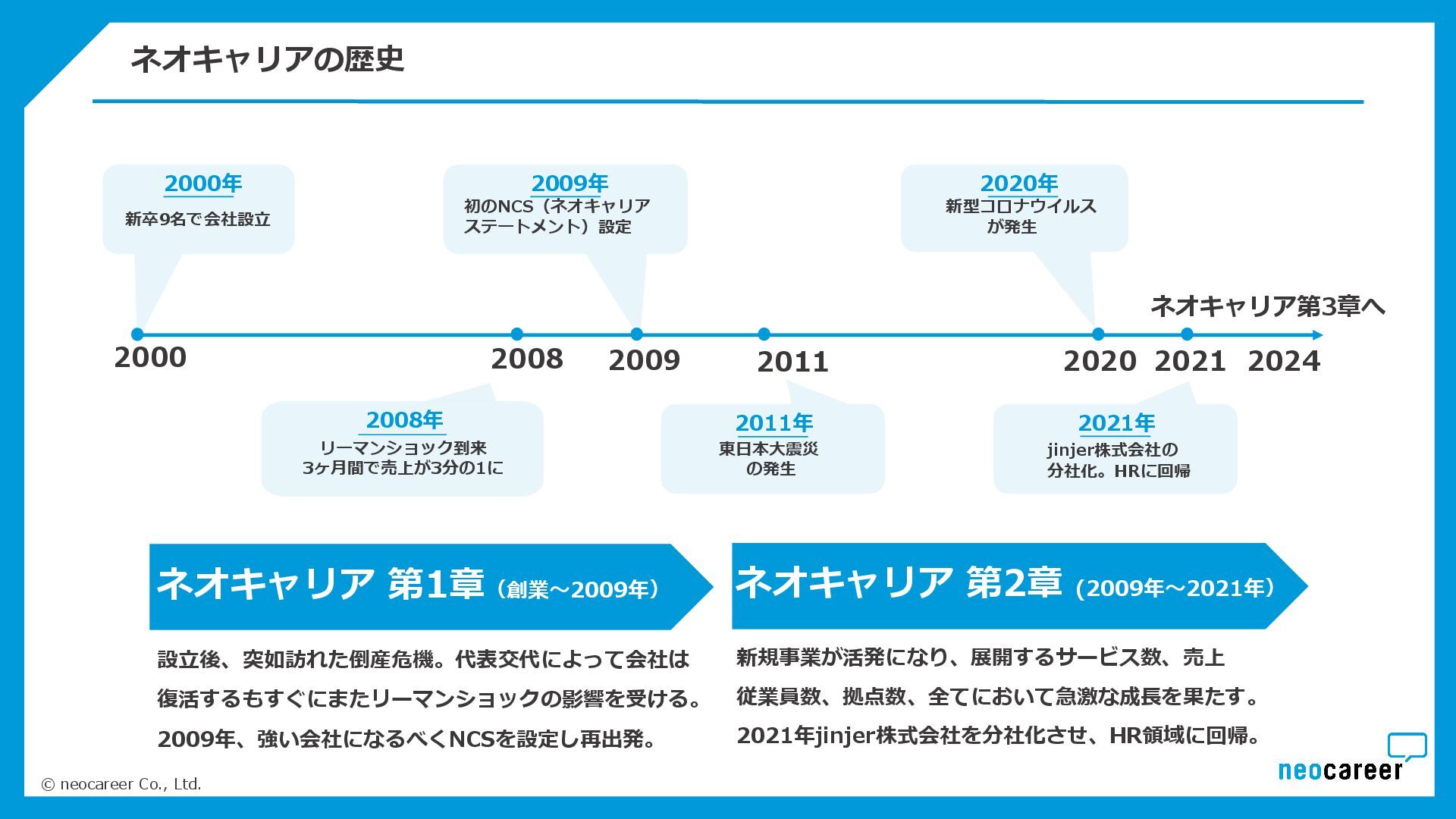 新規事業が活発になり、展開するサービス数、売上 従業員数、拠点数、全てにおいて急激な成長を果たす。 2021年jinjer株式会社を分社化させ、HR領域に回帰。 2000年 新卒9名で会社設立 2008年 リーマンショック到来 3ヶ月間で売上が3分の1に 2000 2008 2024 ネオキャリア第3章へ 2009年 初のNCS(ネオキャリア ステートメント)設定 2009 2011年 東日本大震災 の発生 2020年 新型コロナウイルス が発生 2021年 jinjer株式会社の 分社化。HRに回帰 ネオキャリアの歴史 2020 2021 2011 © neocareer Co., Ltd.