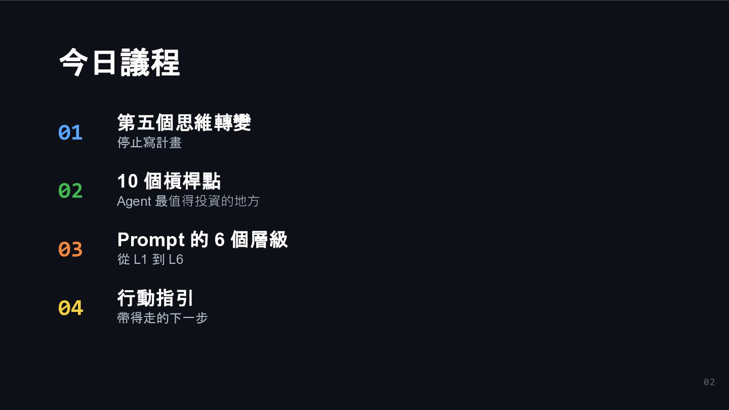 1. 02 今日議程 01 第五個思維轉變 停止寫計畫 02 10 個槓桿點 Agent 最值得投資的地方