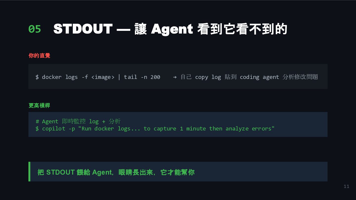 9. 11 05 STDOUT — 讓 Agent 看到它看不到的 你的直覺 $ docker