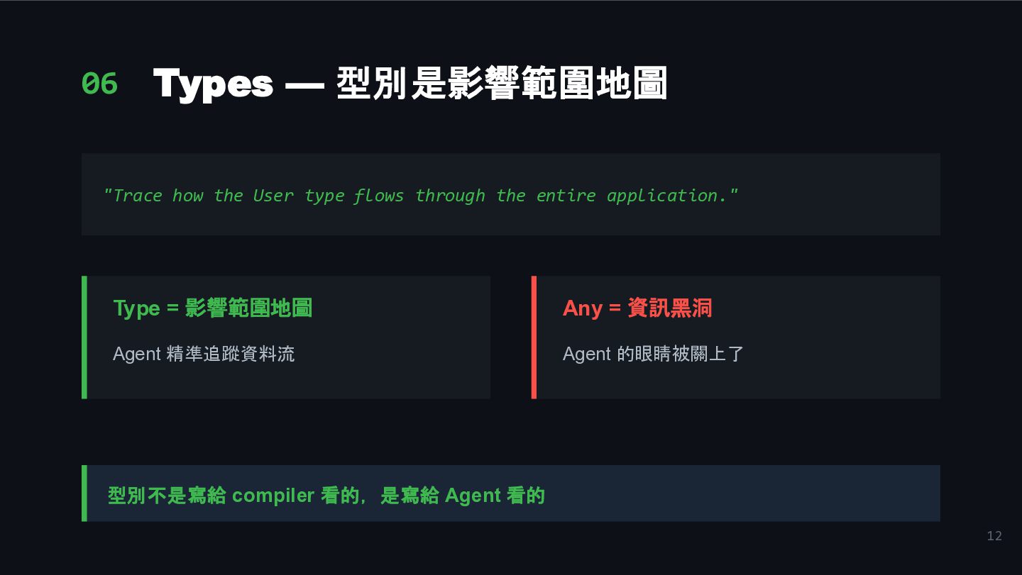flows through the entire application." Type = 影響範圍地圖 Agent 精準追蹤資料流 Any = 資訊黑洞 Agent 的眼睛被關上了 型別不是寫給 compiler 看的,是寫給 Agent 看的