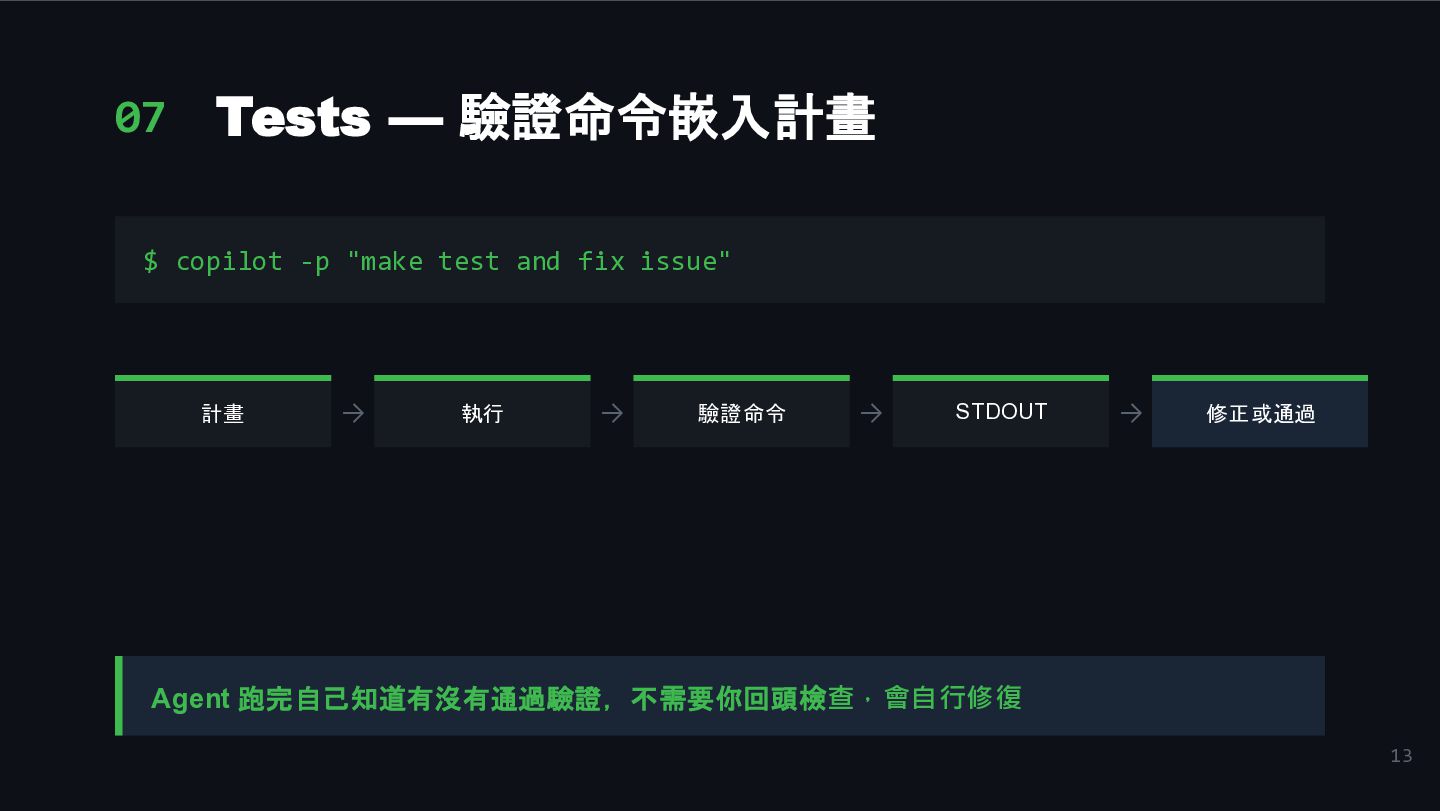 11. 13 07 Tests — 驗證命令嵌入計畫 $ copilot -p "make test