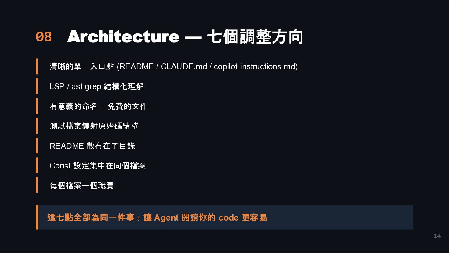 copilot-instructions.md) LSP / ast-grep 結構化理解 有意義的命名 = 免費的文件 測試檔案鏡射原始碼結構 README 散布在子目錄 Const 設定集中在同個檔案 每個檔案一個職責 這七點全部為同一件事:讓 Agent 閱讀你的 code 更容易