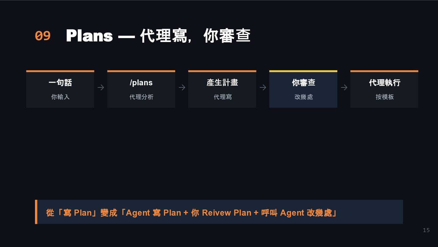 → 產生計畫 代理寫 → 你審查 改幾處 → 代理執行 按模板 從「寫 Plan」變成「Agent 寫 Plan + 你 Reivew Plan + 呼叫 Agent 改幾處」