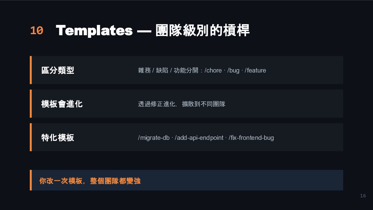 功能分開:/chore · /bug · /feature 模板會進化 透過修正進化,擴散到不同團隊 特化模板 /migrate-db · /add-api-endpoint · /fix-frontend-bug 你改一次模板,整個團隊都變強