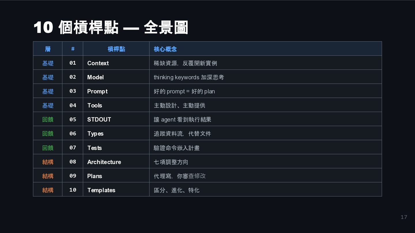01 Context 稀缺資源,反覆開新實例 基礎 02 Model thinking keywords 加深思考 基礎 03 Prompt 好的 prompt = 好的 plan 基礎 04 Tools 主動設計、主動提供 回饋 05 STDOUT 讓 agent 看到執行結果 回饋 06 Types 追蹤資料流,代替文件 回饋 07 Tests 驗證命令嵌入計畫 結構 08 Architecture 七項調整方向 結構 09 Plans 代理寫,你審查修改 結構 10 Templates 區分、進化、特化