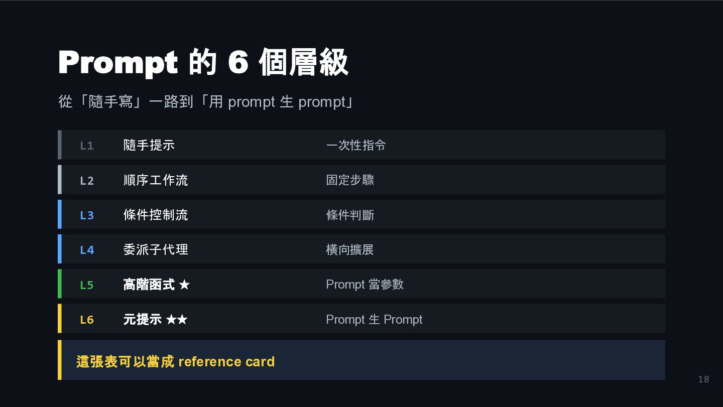 16. 18 Prompt 的 6 個層級 從「隨手寫」一路到「用 prompt 生 prompt」 L1