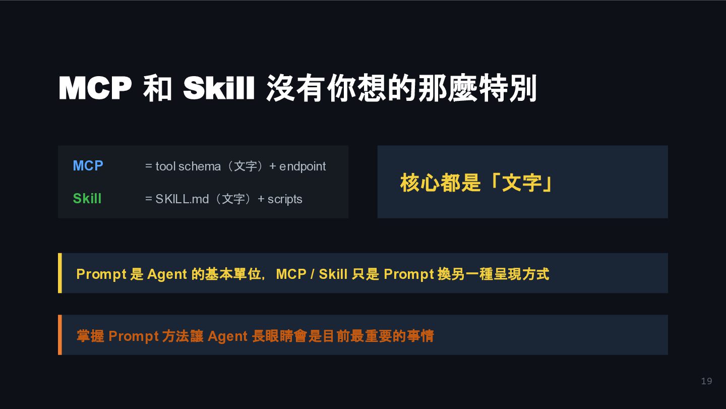 Skill = SKILL.md(文字)+ scripts 核心都是「文字」 Prompt 是 Agent 的基本單位,MCP / Skill 只是 Prompt 換另一種呈現方式 掌握 Prompt 方法讓 Agent 長眼睛會是目前最重要的事情